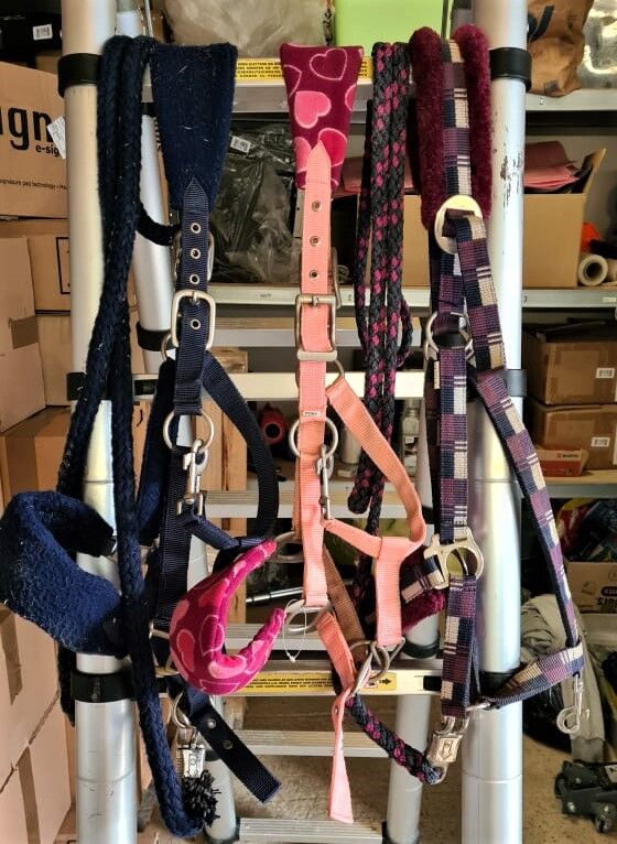 Różne kabury - Sprzedaję trzy różne haltery. Niebieski i fioletowy to Full/WB z pasującym sznurem, a różowy to Pony, zgodnie z etykietą, ale jest bardzo duży i bez problemu pasuje na wąską głowę warmblooda. Za sztukę 5,00 €