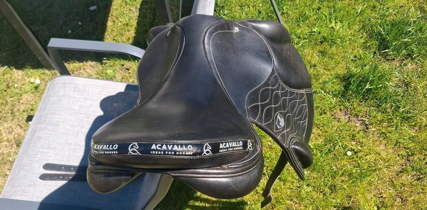 Saddle Acavallo - Siodełko Acavallo 17,5 cala - stan bardzo dobry, z możliwością personalizacji Sprzedaję wysokiej jakości siodło Acavallo z siedziskiem 17,5 cala. Siodło kupiłem nieużywane bezpośrednio od sprzedawcy dla mojego młodego konia, ponieważ można je optymalnie dopasować dzięki regulowanej płycie wpustowej (za pomocą klucza imbusowego) - idealnej dla rosnących koni. Siodło było zawsze przechowywane w suchym pomieszczeniu i zawsze z pasującą podkładką pod siodło. Dlatego jest w dobrym stanie ogólnym.