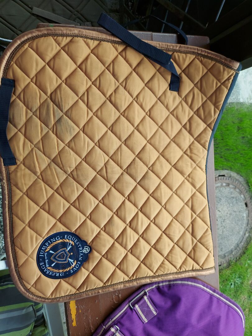 Saddlecloth w kolorze złotego brązu na sprzedaż - Sprzedam złotobrązowe siodło ujeżdżeniowe. Niestety podczas prania nie udało mi się pozbyć czarnych plam, dlatego sprzedaję ją w bardzo dobrej cenie. Czarne plamy nie są zauważalne pod siodłem ze względu na dobre skubanie z przodu. Wysyłka jest możliwa jeśli pokryję koszty wysyłki. W razie jakichkolwiek pytań zapraszam do kontaktu. Pozdrawiam