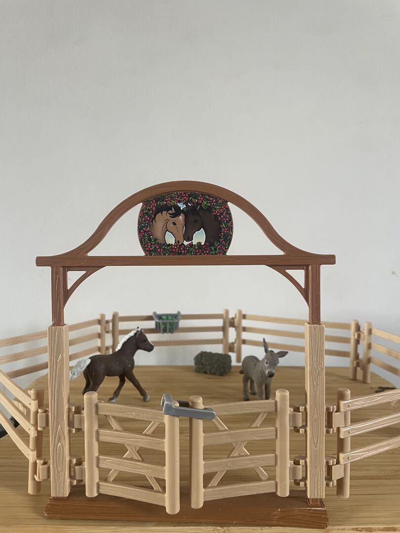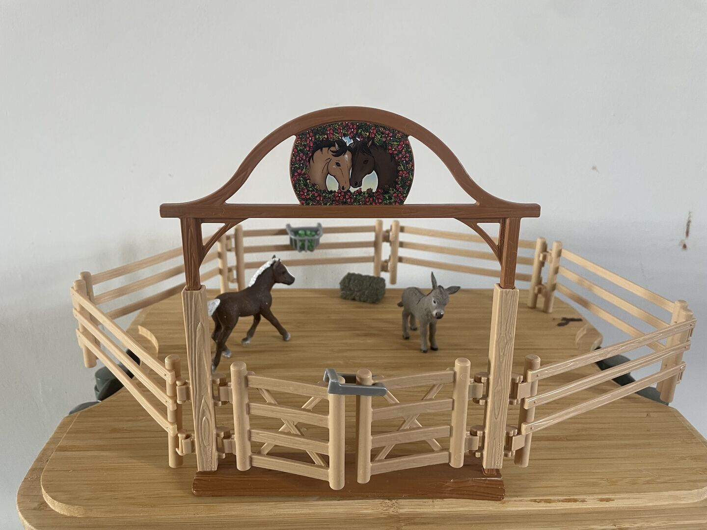 Schleich padok, wybieg - Na sprzedaż bardzo dobrze zachowany wybieg od Schleich z akcesoriami. W zestawie wybieg, źrebak i osioł, a także bela siana i koryto do karmienia.