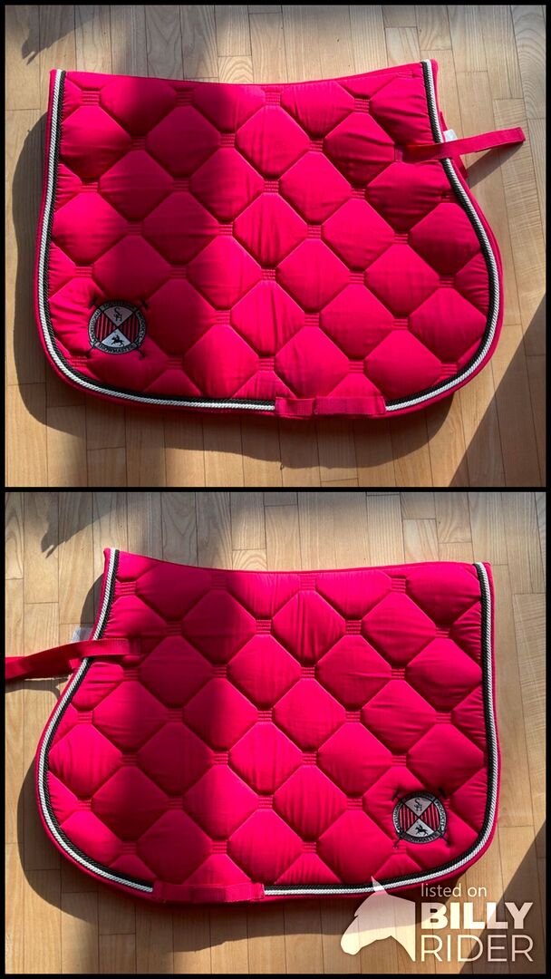 Schowmaster Saddle Pad VS DR pink - Sprzedaję podkładkę pod siodło firmy Showmaster. Krój to VS, ale jest nieco większy, dzięki czemu zmieści się na nim również siodło ujeżdżeniowe. Podkładka pod siodło nie posiada żadnych dziur ani rozdarć. Tkanina siodła tylko w dwóch miejscach trochę się odbarwiła, ale nie jest to już widoczne przy założonym siodle. Podkładka pod siodło jest świeżo wyprana