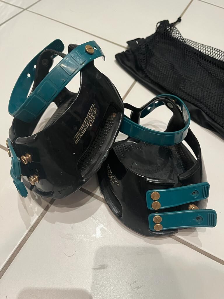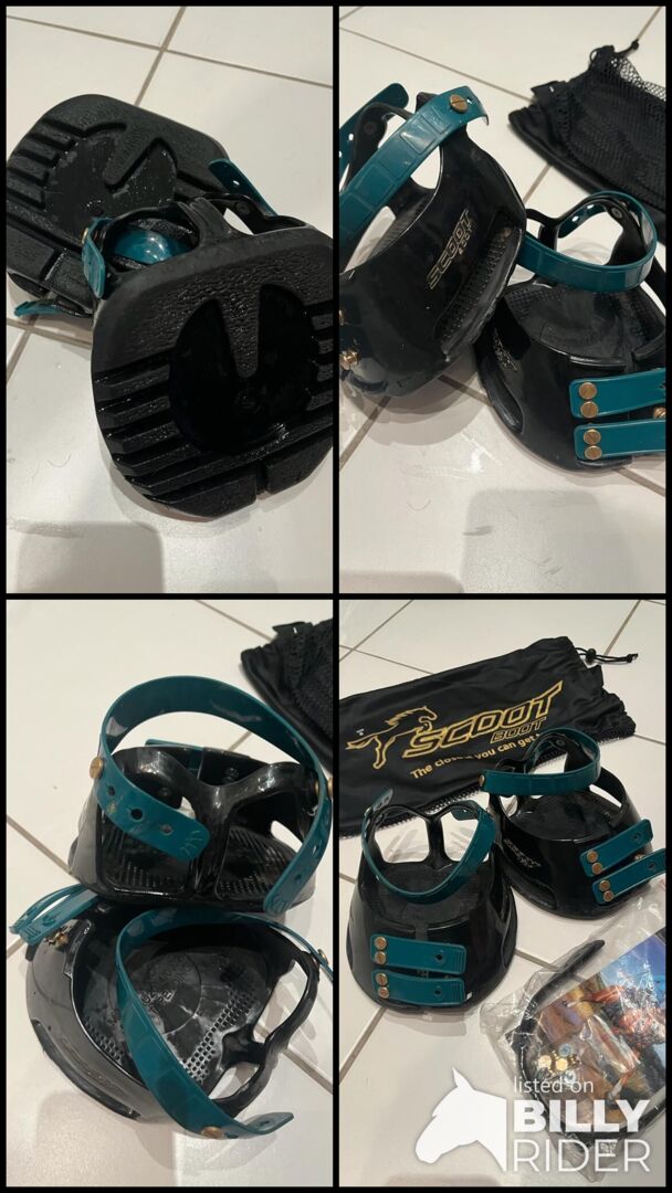 Najwyższy stan 1 para, bez wad Buty kopytowe Scoot Boots w rozmiarze 5 z akcesoriami z dopasowanymi paskami z klamrami (nowa cena od 185 €) w kolorze czarnym lub benzynowym gotowe do sprzedaży jak na zdjęciach. Super wygodne, szykowne do oglądania, bardzo sprawdzone, przepuszczające powietrze, odprowadzające wodę, górne buty kopytowe jako zamiennik wszelkich podków lub butów klejowych jako ochrona lub dla koni z wrażliwymi kopytami. Cena stała, zostaną wysłane ubezpieczoną przesyłką lub odbiór w Berlinie Westend. Mało noszone, niestety za duże.