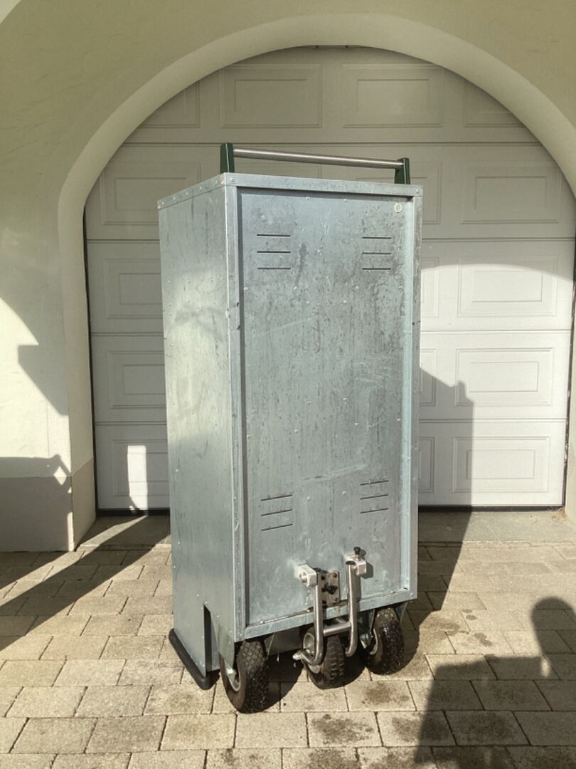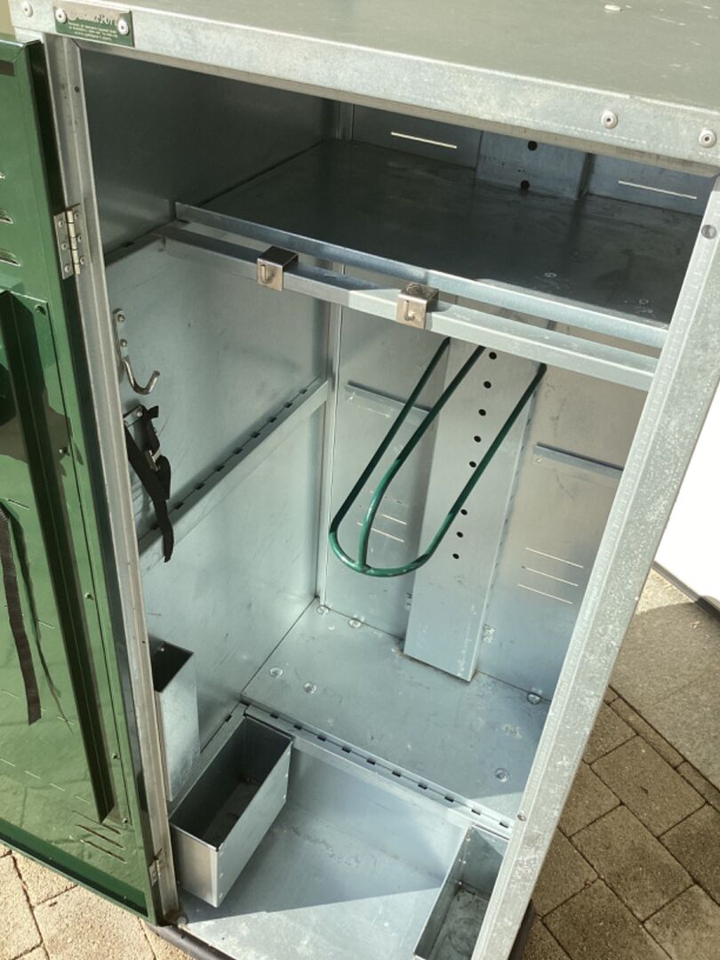 Sellaport Mobilna szafka na siodła - Mobilna szafka pod siodło/wózek do przewożenia koni marki Sellaport, wykonana z aluminium, stan dobry, zamykana, oferuje dużo miejsca do przechowywania i liczne regulowane przegródki i uchwyty, patrz zdjęcia.