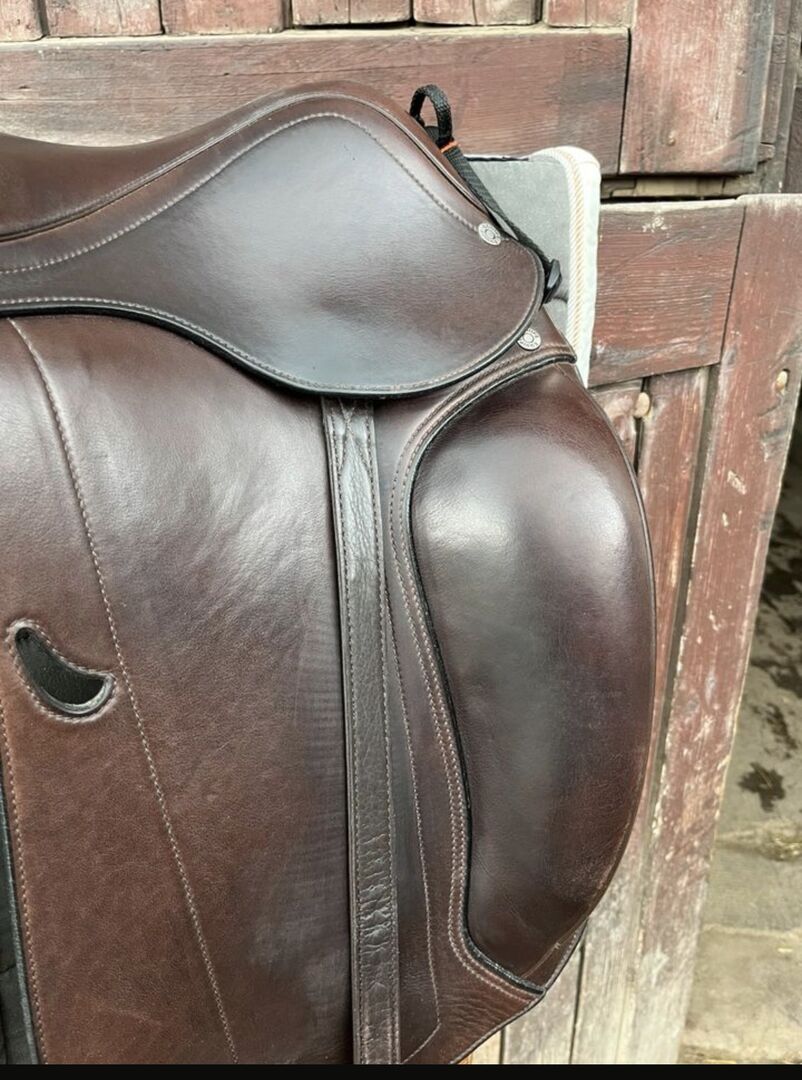 Selleria Equipe Emporio / siodło ujeżdżeniowe z klapą mono - Sprzedam używane siodło ujeżdżeniowe Selleria Equipe Emporio mono flap. 17 cali, szerokość komory 33-34, jak podano w ówczesnym ogłoszeniu. Sami kupiliśmy je z drugiej ręki i używaliśmy tylko po to, by "wcisnąć je z powrotem" po kontuzji. Było założone na andaluzyjczyka o okrągłych żebrach i prostym, raczej krótkim grzbiecie. Byliśmy w stanie wrócić do jazdy szybciej niż się spodziewaliśmy, co z jednej strony jest świetne, ale z drugiej strony jesteśmy trochę smutni, ponieważ siodło już nie pasuje i chcielibyśmy nadal go używać. Dzięki głębokiemu siedzisku i wyraźnym rolkom kolanowym jeździec siedzi bardzo wygodnie i ma dobre wsparcie. Siodło ma plastikowe drzewo, dzięki czemu jest lekkie i elastyczne. Dzięki klapie mono siodło zapewnia jeźdźcowi bardzo bliski kontakt z koniem i umożliwia czułą komunikację. Nie można siedzieć bliżej konia! Panele: panele bananowe z francuskim zawieszeniem i lateksowym wypełnieniem. Siodło można również przymierzyć za kaucją w wysokości ceny zakupu (76356 Weingarten), ale nie zostanie wysłane na próbę. Dokładne koszty wysyłki nie zostały jeszcze ustalone. Sprzedaż odbywa się z wyłączeniem jakiejkolwiek odpowiedzialności za wady materiałowe!