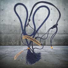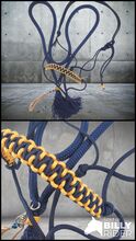 SET wiązany kantar z miękkim pierścieniem na szyję ręcznie robiony warmblood - Piękny zestaw kantara z miękką obrączką na szyję ręcznie robiony rozmiar warmblood Zestaw składający się z wiązanego halterka z 3-kolorową wiązaną opaską na nos w kolorze złotym/granatowym. W zestawie z dopasowaną kolorystycznie linką na szyję i zaciskiem sprężynowym.