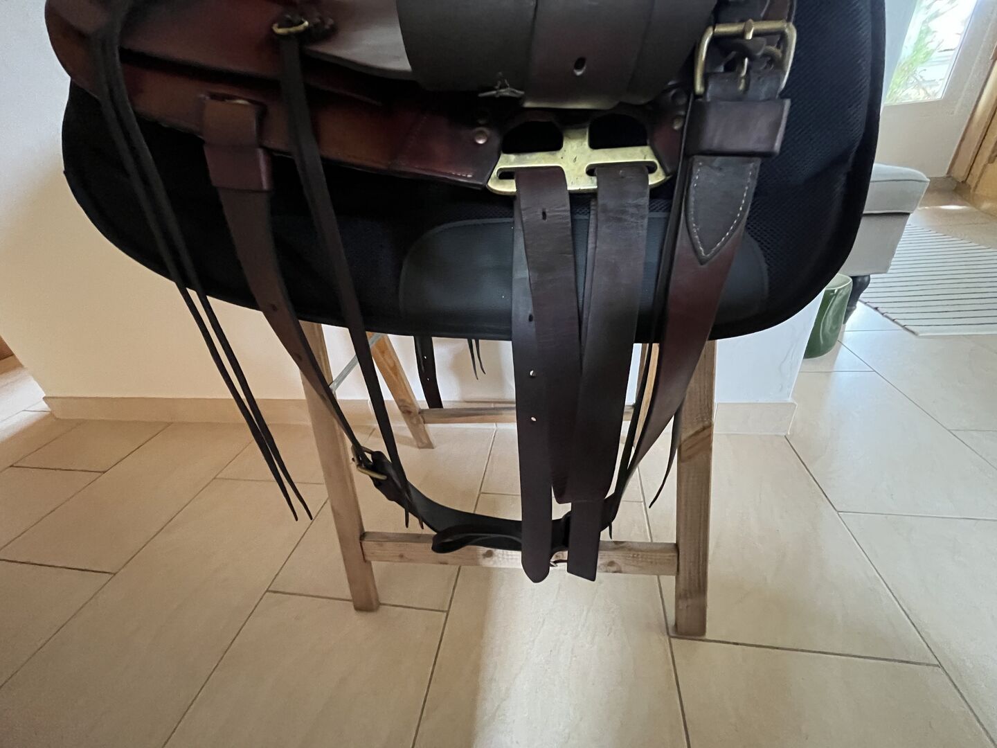 Do sprzedania piękne, bardzo zadbane siodło westernowe SS 15 CC-4 wraz z odpinanym popręgiem tylnym, latigo, kęsami i nowymi strzemionami. Długość 56 cm. Leżące na VA z szerokim łękiem.