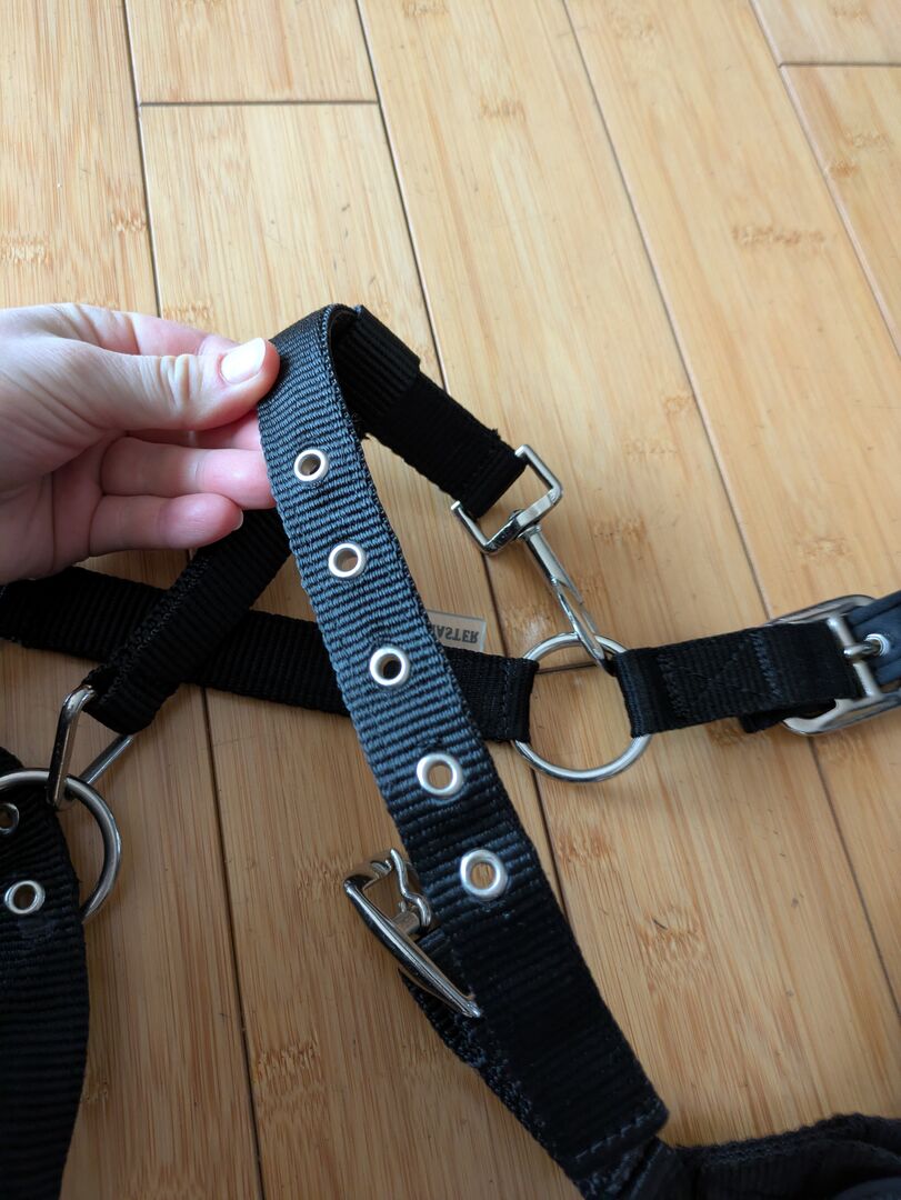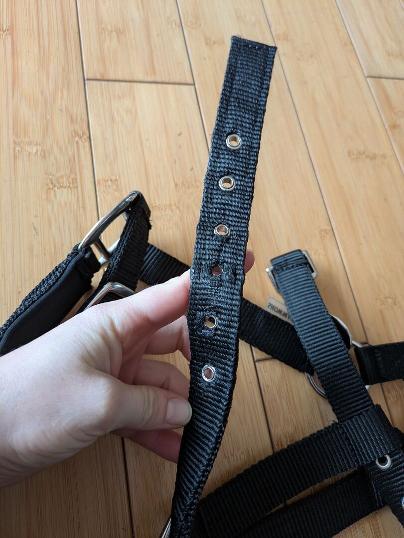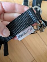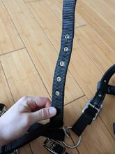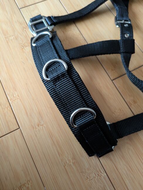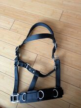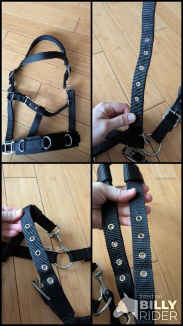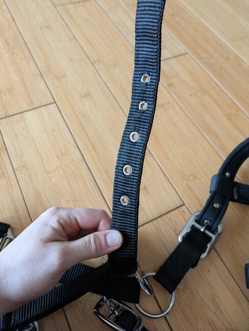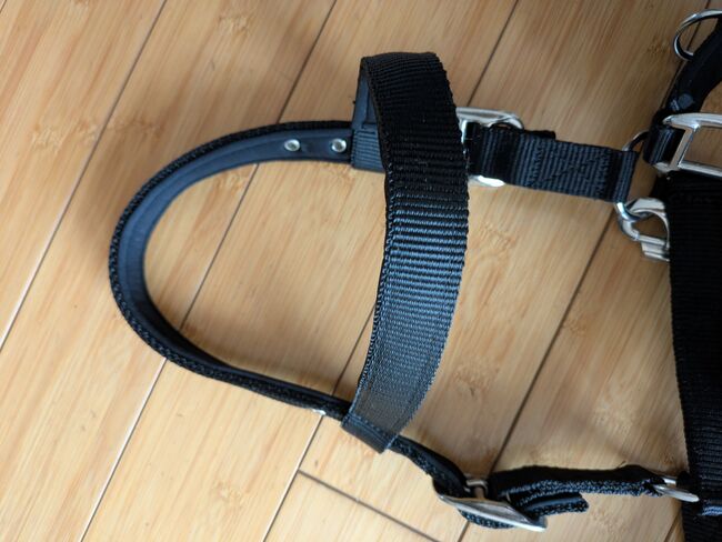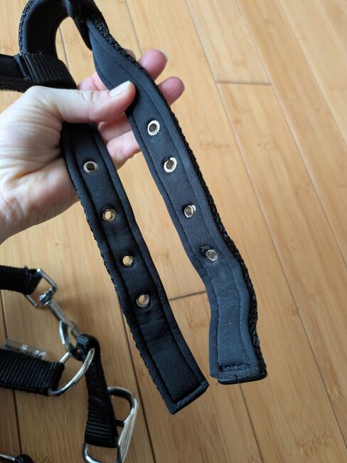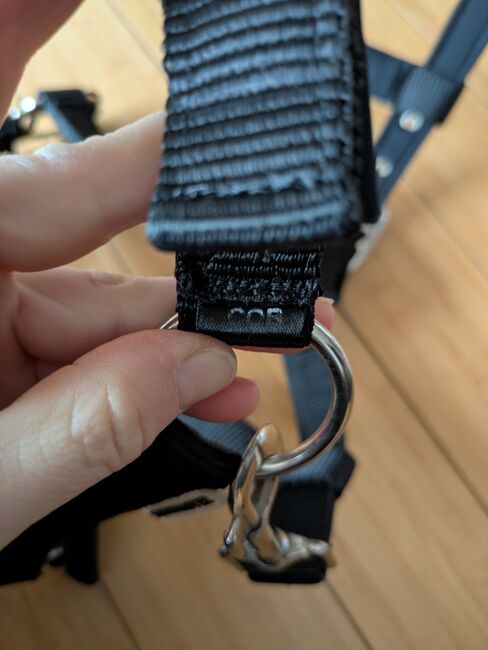 Showmaster COB cavesson, czarny materiał - Używany ogłowie w bardzo dobrym stanie. Sprzączki na pasku nosowym są najbardziej zużyte, ale nadal w dobrym stanie (patrz zdjęcie). Pasek na czoło nie był używany, ponieważ nie pasował na mojego konia (mój koń jest małym ciepłokrwistym). W związku z tym jest nowy. Cavesson pasuje do COB i koni pełnej krwi angielskiej. Może również pasować do koni pełnej krwi w zależności od ich rozmiaru.