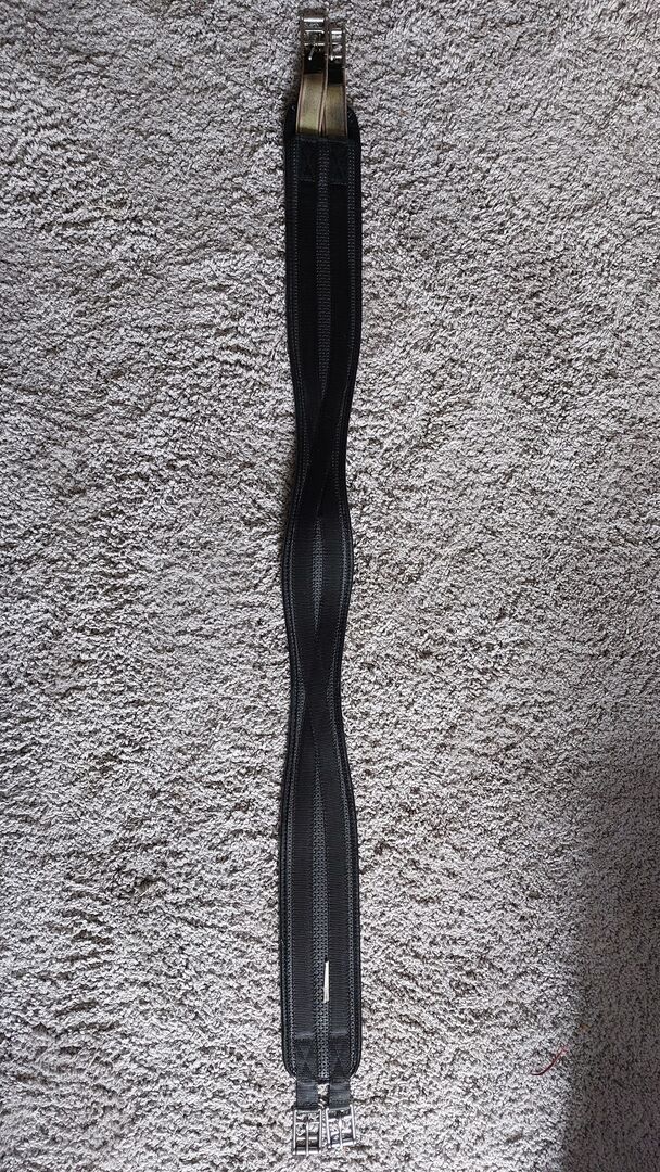 Showmaster Leather Saddle Girth 140cm - W ofercie girlanda firmy Showmaster w kolorze czarnym. Ma 140cm długości i nadal jest w bardzo dobrym stanie. Sprzedaję go, ponieważ stał się za duży na mojego konia. Pas ma z jednej strony elastyczne wstawki, które trochę ułatwiają jego wykonanie. Klamry działają bez zarzutu, czyli nie haczą i nie rdzewieją.