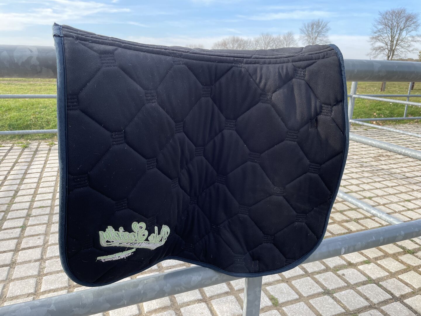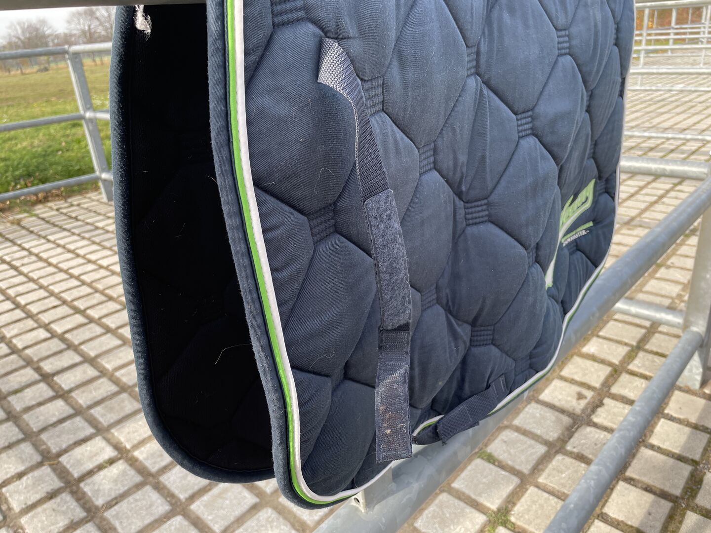 Showmaster Saddle Pad Blue Polo Society w VS - Podkładka pod siodło o sportowym kroju. Napis "Polo Society" po obu stronach. Szlufki na siodło i uzdę z praktycznym zapięciem na rzep. Spód wykonany z oddychającego i pochłaniającego wilgoć materiału z siateczki powietrznej. Strona zewnętrzna 100 % bawełna, wyściółka i spód 100 % poliester.