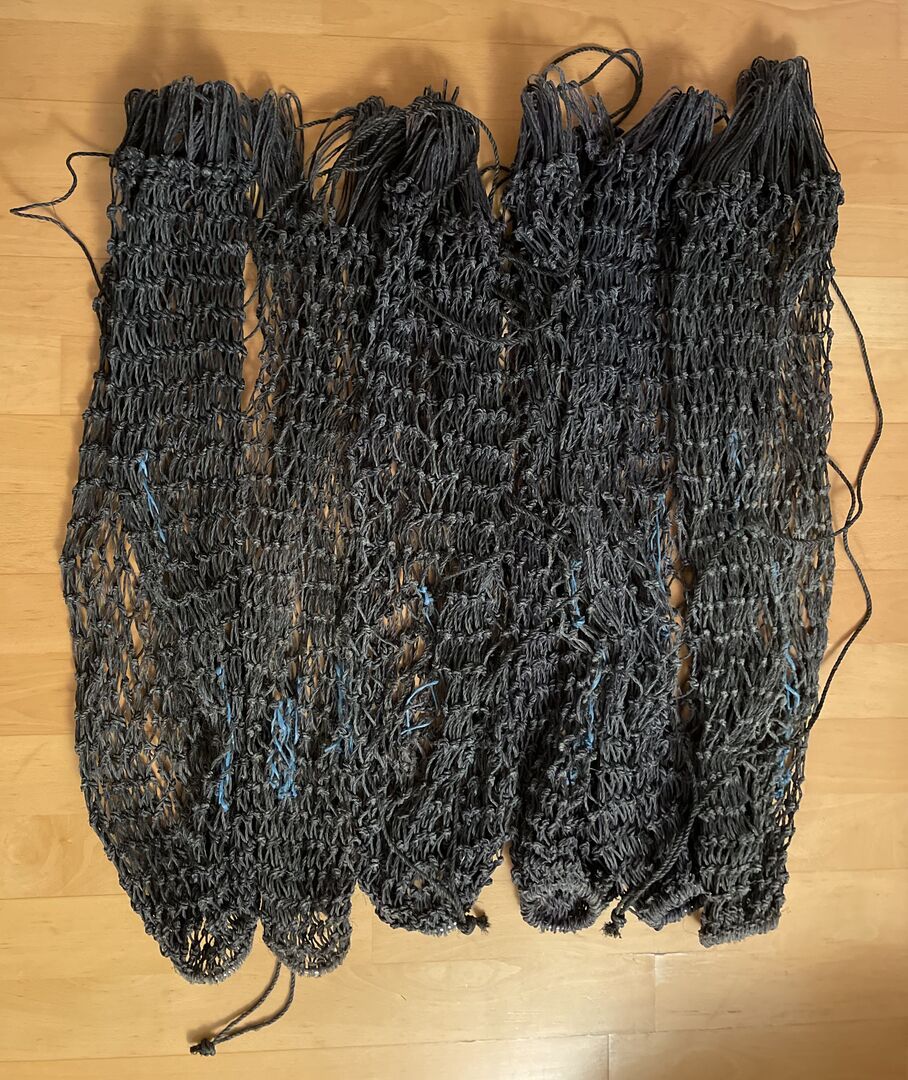 Siatki na siano, duże, czarne, wielkość oczek ok. 5x5 cm - Sprzedam sześć używanych dużych siatek na siano, są one czarne lub granatowe i mają oczka o wielkości ok. 5x5 cm. Długość ok. 110 cm, u dołu metalowy pierścień. Prawdopodobnie zmieści się w nich ok. 9-11 kg siana. Ponieważ siatki pochodzą od różnych dostawców mogą występować niewielkie różnice w rozmiarze, kolorze, wielkości oczek lub materiale. Wszystkie siatki są wyprane. Dostępne jest sześć naprawionych siatek (patrz zdjęcia), wszystkie siatki są w pełni sprawne!
