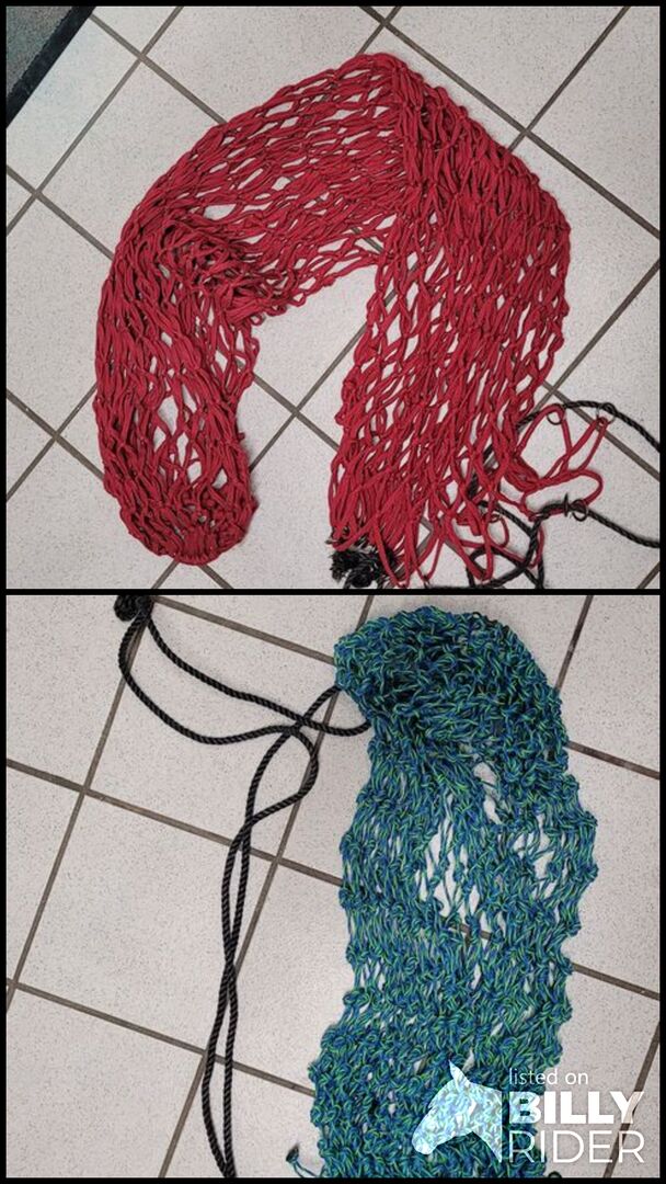 Siatki na siano o małych oczkach - Dwie siatki na siano, jedna w kolorze niebieskim/zielonym i jedna w kolorze różowym. Cena za siatkę Używane, ale w dobrym stanie.