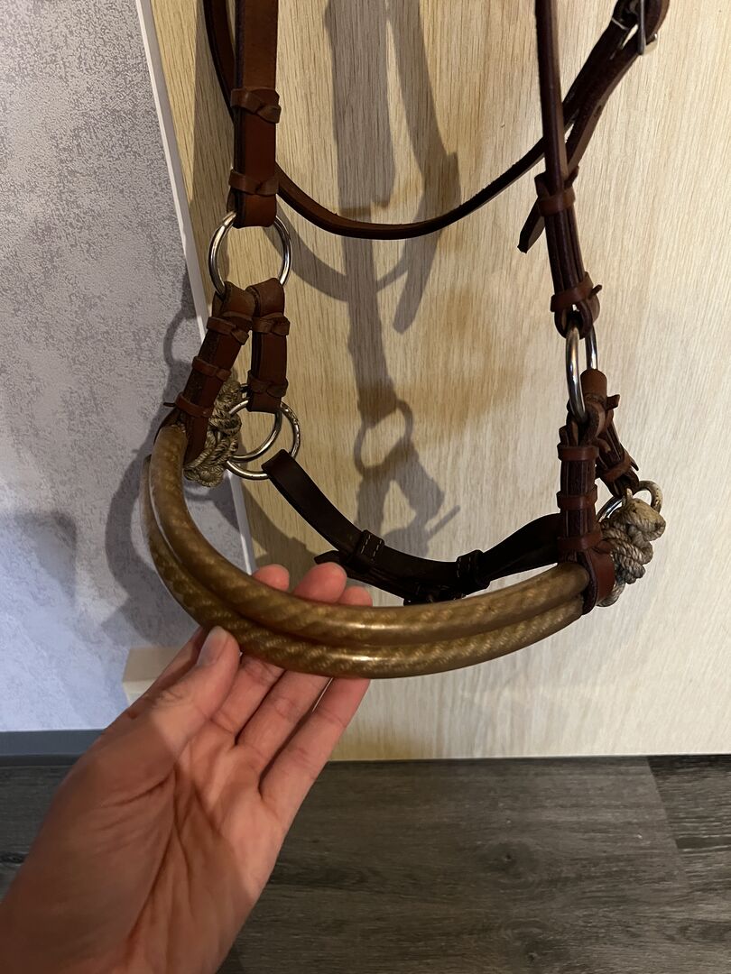Sprzedaję używany, ale w dobrym stanie sidepull w rozmiarze Full. Skóra wymaga trochę miłości i natłuszczenia, ale nie jest krucha ani wyjątkowo sztywna. Nosek jest pokryty gumową rurką. Niestety nie pasuje na mojego konia tak, jak się spodziewałem, więc może iść dalej. Nie jest przeznaczony dla koni, które mają większą głowę WB i bardziej skłaniają się ku zimnej krwi. Normalna głowa standardowej krwi ciepłokrwistej idealnie pasuje do sidepulla. Kolor sidepulla jest taki, jak na zdjęciu nr 6. Pasek na czoło jest wszyty na okrągło i ma oczko do oddzielenia szyi.
