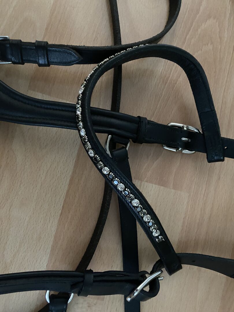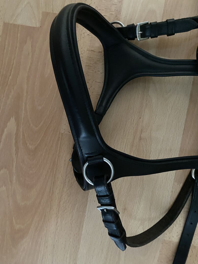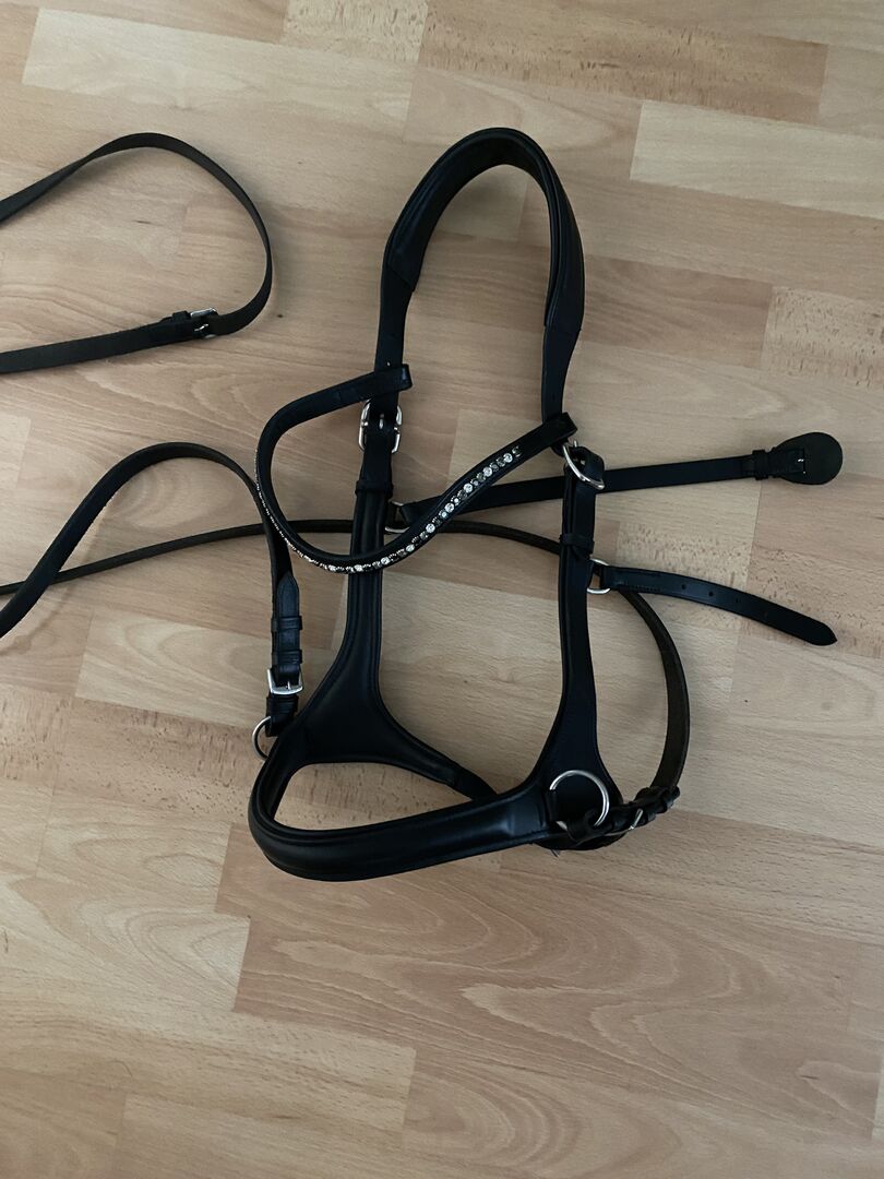 Sidepull Lindel firmy USG w kolorze Cob ze skórzanymi lejcami - Sprzedaję tutaj trochę zużyty sidepull/indel od USG, w tym pełne skórzane lejce. Rozmiar sidepulla to Cob/VB. Wymieniłem opaskę na WB, ponieważ moje konie mają oczywiście zbyt szerokie brwi i szczypią ich uszy.