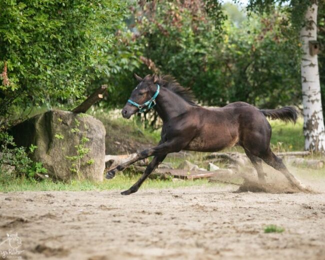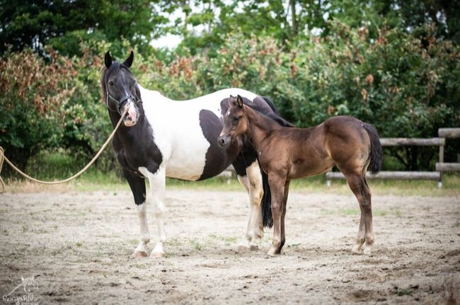 silny charakter spokojna klacz Quarter Paint Horse odsadzona Ranchriding - Nazywam się mała Sikari (indyjski = słodki) i jestem czarną klaczką. Urodziłam się w maju 2025 roku i szukam kochającego właściciela po odsadzeniu w grudniu. Moim ojcem jest Black Starbuck, 154-centymetrowy ogier z najlepszym rodowodem. Moją mamą jest Special Velvet Mount, klacz premium (1.46). Moja mama to 6Panel n/n. Od pierwszego dnia jestem prawdziwym łobuziakiem, który chce się dużo przytulać i odkrywać wszystko. Kiedy dorosnę, będę miał około 1,50 metra wzrostu. Już teraz jestem bardzo silnym i muskularnym źrebakiem, super przyszłym koniem ranczerskim. Jestem na tyle odważny, by stawić czoła wszystkiemu, co nowe i dokładnie wiem, czego chcę. Mam to po mamie :) Dorastam w mieszanym stadzie na padoku. Mogę więc biegać, bawić się i jeść tyle, ile chcę. Mam nadzieję, że tak pozostanie z moim nowym właścicielem. Nie chcę być w boksie, nawet w nocy. Do czasu odsadzenia Sikari jest regularnie odrobaczana, zapoznawana z kowalem i uczy się źrebięcego ABC. Bardzo ważne jest dla nas, aby nasze źrebięta były dobrze wychowane i przyjazne. Sikari otrzymuje również paszport koński od PHCG i papiery APHA. Jeśli Sikari wzbudził Twoje zainteresowanie, skontaktuj się z nami, aby uzyskać więcej informacji. Nasze źrebięta są umieszczane wyłącznie w stajniach odpowiednich dla danego gatunku (stajnia otwarta/stajnia czynna/ścieżka na padoku itp.) i w kochających rękach, które są również gotowe zaoferować swojemu małemu skarbowi życie pełne dorastania i swobodnych ćwiczeń. www.harzhof-minsleben.de
