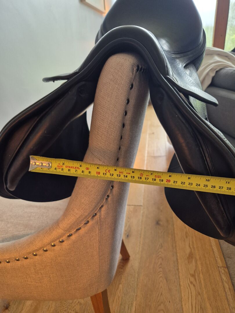 Antares France black 17.5 inch saddle. This is a very comfortable saddle to ride in. I had it for a 15.3 medium build high wither horse. It is missing one logo button on flap and one girth guard.
