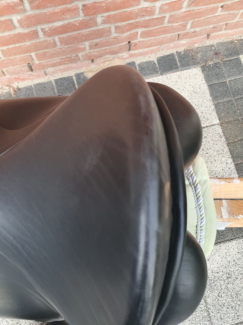 Siodło ma ładną, równą wyściółkę i prawie żadnych śladów zużycia na panelach i panelach Nie mogę znaleźć żadnych informacji o rozmiarze. Ma 43 cm od gwoździa siodła do środka kantara, czyli około 17 cali. Komora ma około 13,5 cm szerokości na wysokości gwoździ siodła. Skóra ma ziarnistą strukturę.
