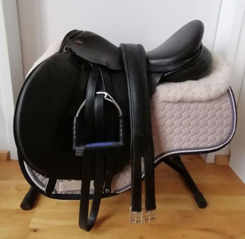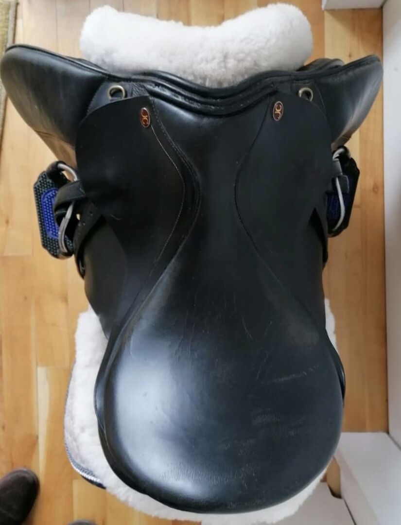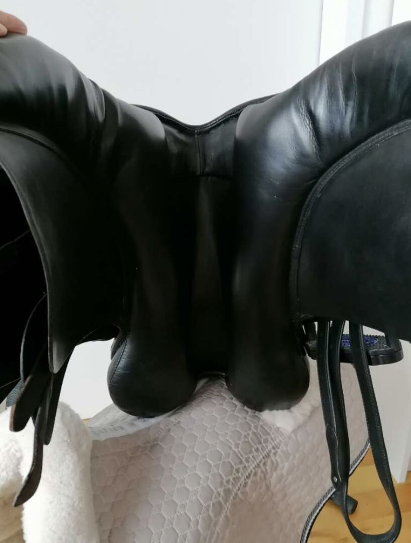 Siodełko JC Jorge Canaves, model Rubin, 17,5 cala - Siodło skokowe JC 17,5 cala model Rubin, szerokość komory 13, szerokość środka 23. Wraz z klapami siodła Passier. Bez strzemion i popręgu Bardzo wygodne i łatwo regulowane siodło, Wyściółka odnowiona przez rymarza, regularnie pielęgnowane i smarowane jest zmiana stylu jazdy.
