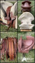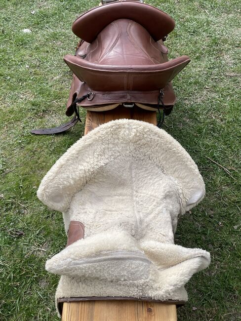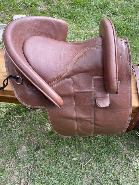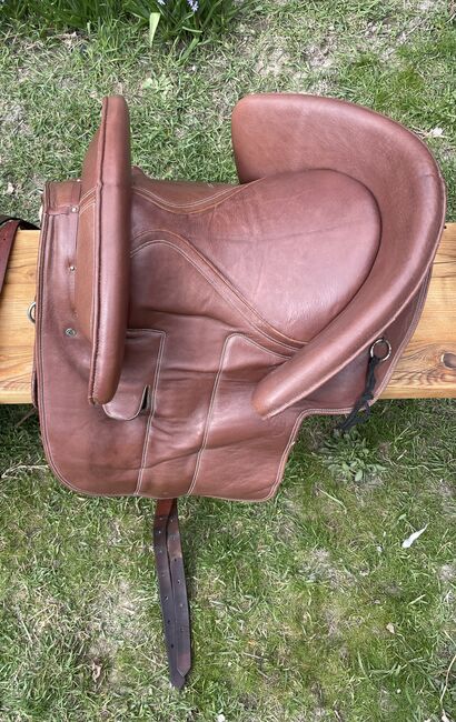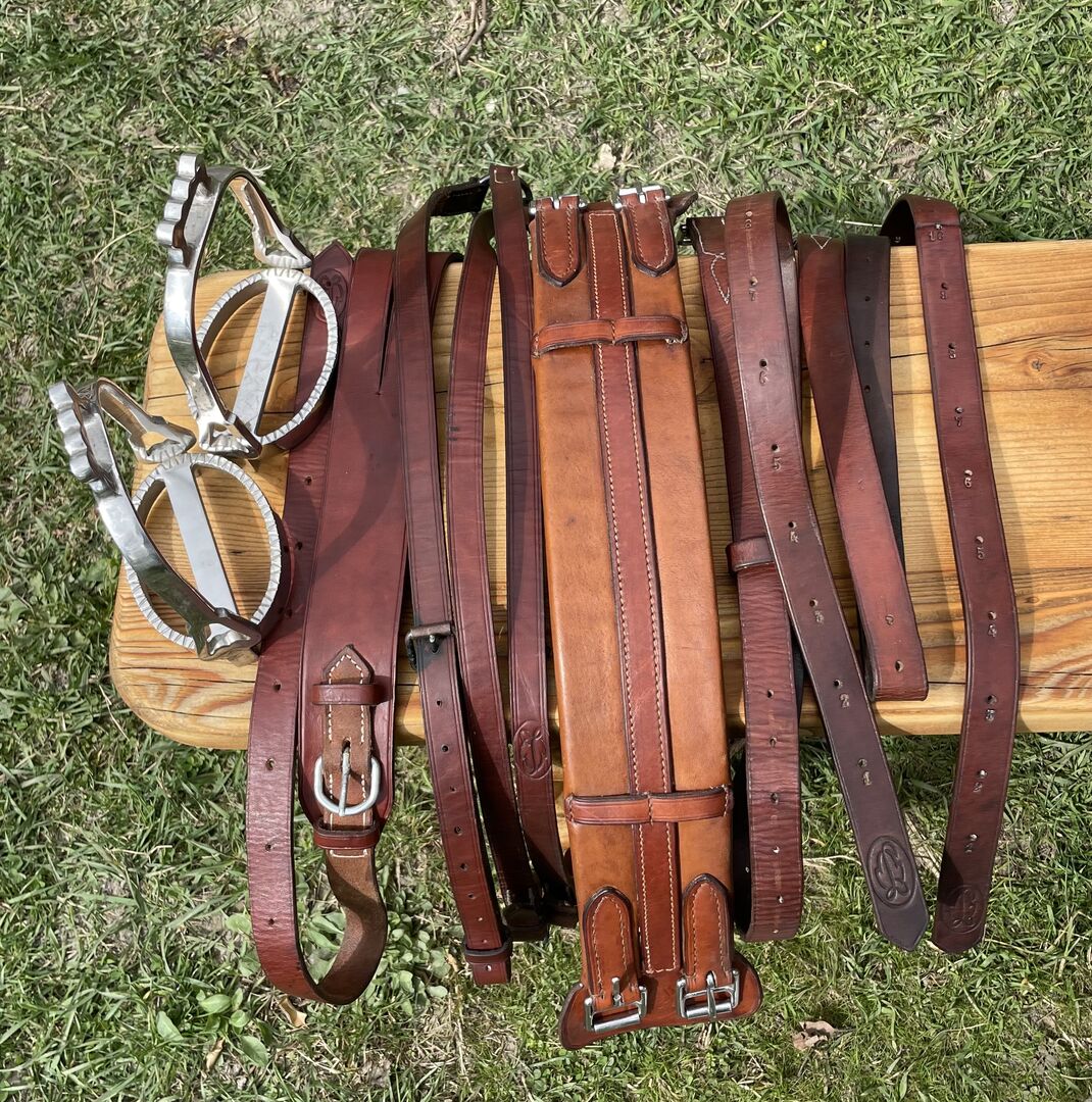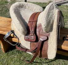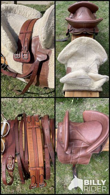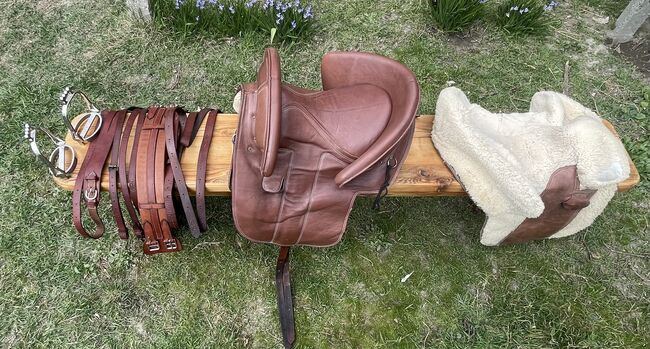 Siodło jest sprzedawane z popręgiem, strzemionami i paskami, przednim łękiem, crupperem i pokrowcem.