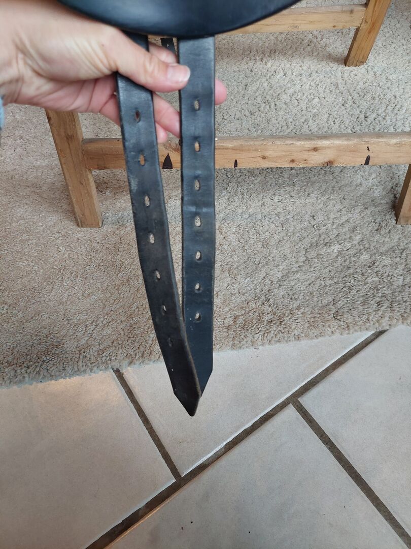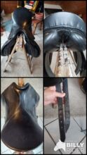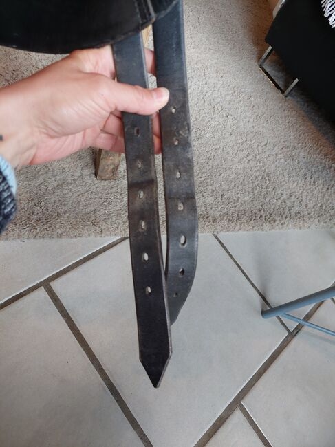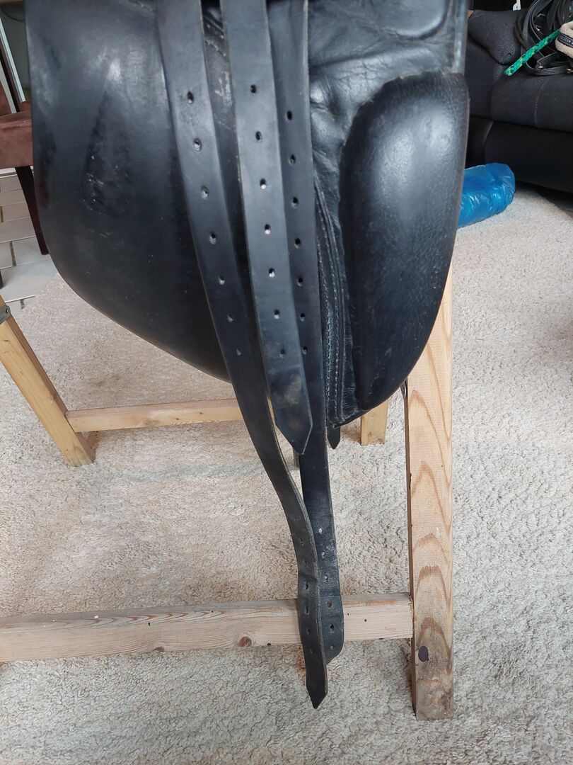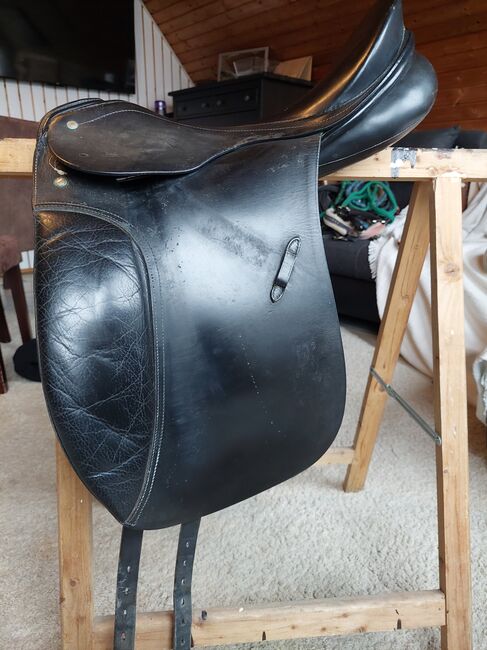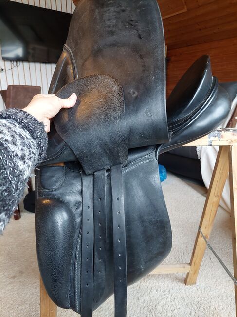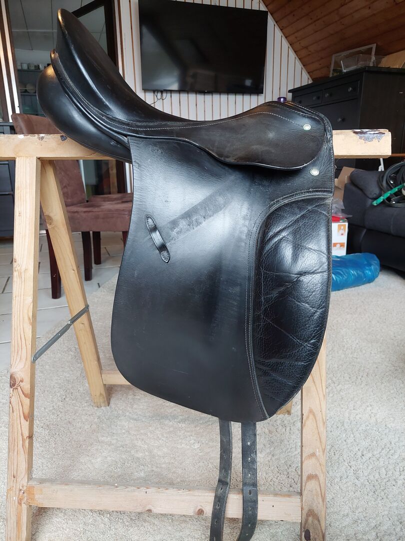17 cali. Siodło ma zwykłe ślady użytkowania, ale ogólnie jest w dobrym stanie. Zostało zamontowane na szczupłym hanowerze o wzroście 1,70 m.
