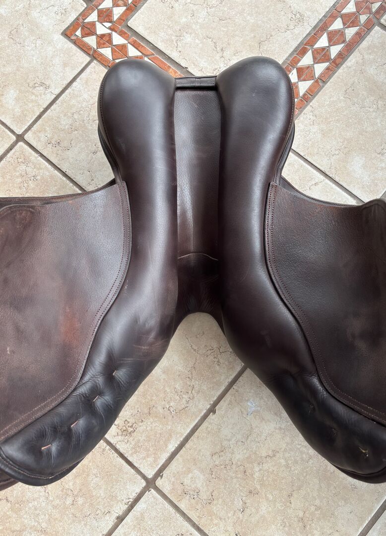 Siodło zostało dopasowane do wąskiego konia rasy warmblood i zostało świeżo wyściełane. Podsumowując, wysokiej jakości, wygodne siodło.