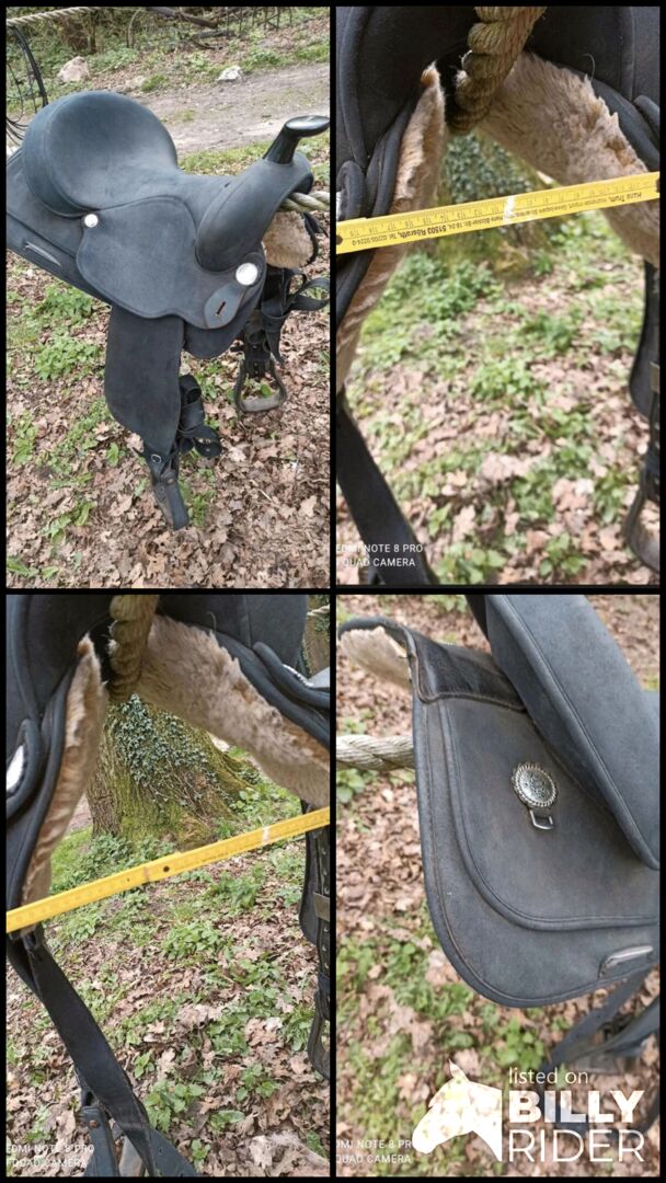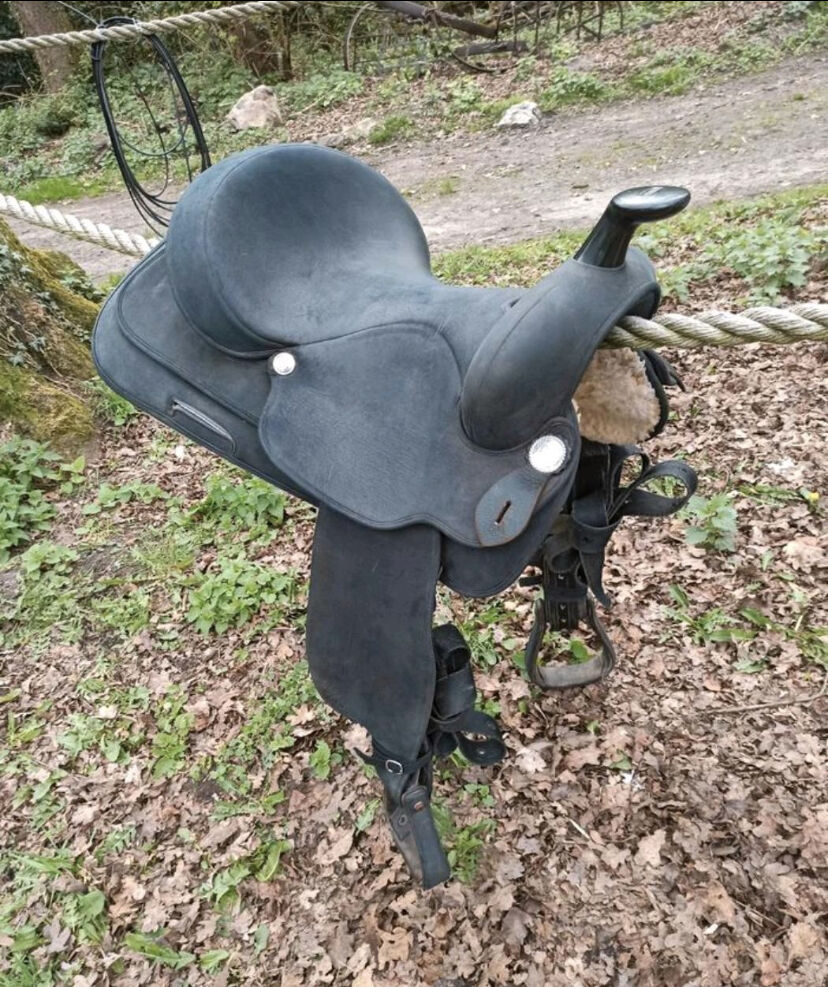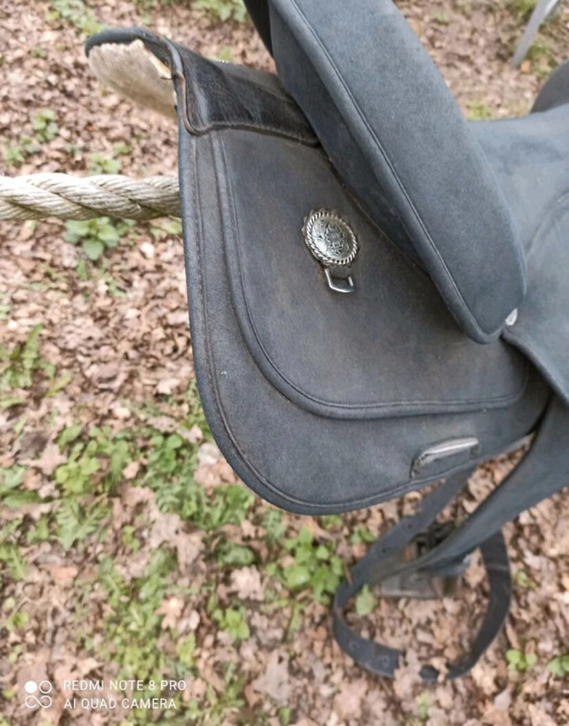 Siodełko westernowe Wintec-light - Oferuję używane siodło westernowe Wintec. Było używane tylko raz na moim koniu do jazdy próbnej. Niestety nie pasuje na mojego konia :( Świetne siodło, nie ma prawie żadnych śladów użytkowania, ale śruby są trochę zardzewiałe. (Strzemiona) Jeśli komuś to przeszkadza, można je bez problemu wymienić samemu. Rozmiar siedziska: 16 cali. Całkowita długość siodła wynosi 60 cm, więc nadaje się również do krótszych końskich grzbietów. Nadaje się również dla koni o dużym kłębie. Bardzo lekki plastikowy łęk nie kołysze się prawie wcale. Na pytania odpowiemy z przyjemnością.
