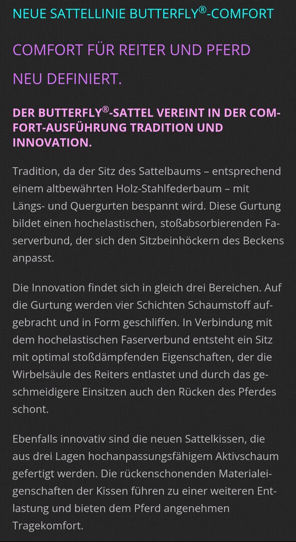 Nowa linia siodeł Butterfly®-COMFORT KOMFORT na nowo zdefiniowany dla jeźdźca i konia. Wersja COMFORT siodła Butterfly® łączy w sobie tradycję i innowację. Tradycja, ponieważ siedzisko siodła jest pokryte podłużnymi i poprzecznymi paskami - podobnie jak wypróbowane i przetestowane drewniane i stalowe drzewo sprężynowe. To opasanie tworzy wysoce elastyczny, pochłaniający wstrząsy kompozyt włókien, który dostosowuje się do guzów kulszowych miednicy.