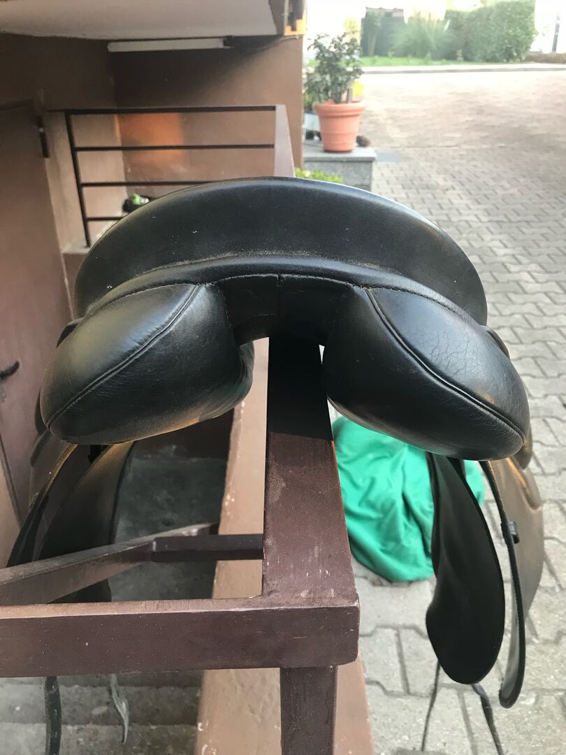 Siodło dla konia z uzdą - Sprzedam siodło dla konia do chodu, czarne z długimi pasami do popręgu i mocnymi klockami. Posiada normalne ślady użytkowania. Rozmiar siedziska to 17,5. Siodło było założone na konia rasy American Saddlebred z wysokim kłębie.