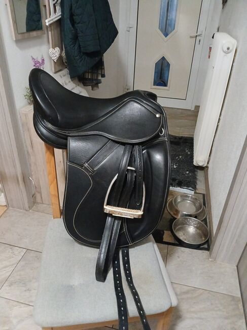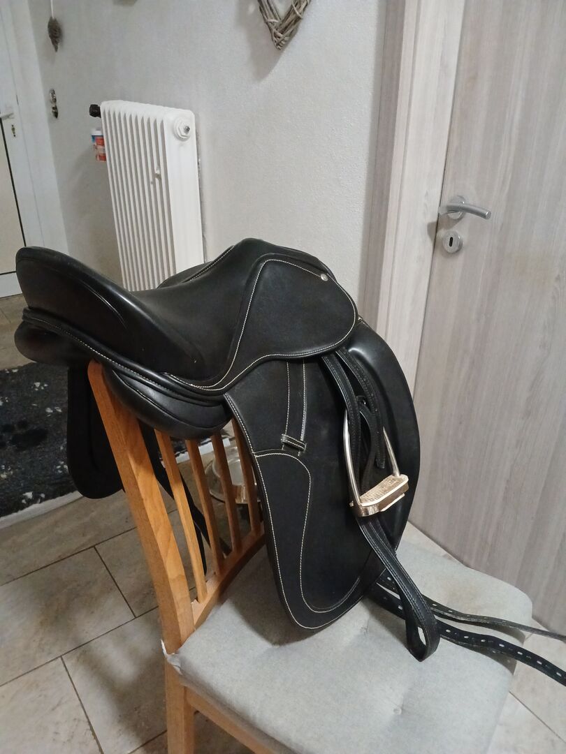 Siodło drelichowe - Ładne, lekkie siodło z dodatkowymi 4 łękami i strzemionami. Siedzisko 17,5 i długość siodła 43 cm. Używane tylko jako dodatkowe siodło. Jeśli masz jakieś pytania, po prostu napisz VB 450 €