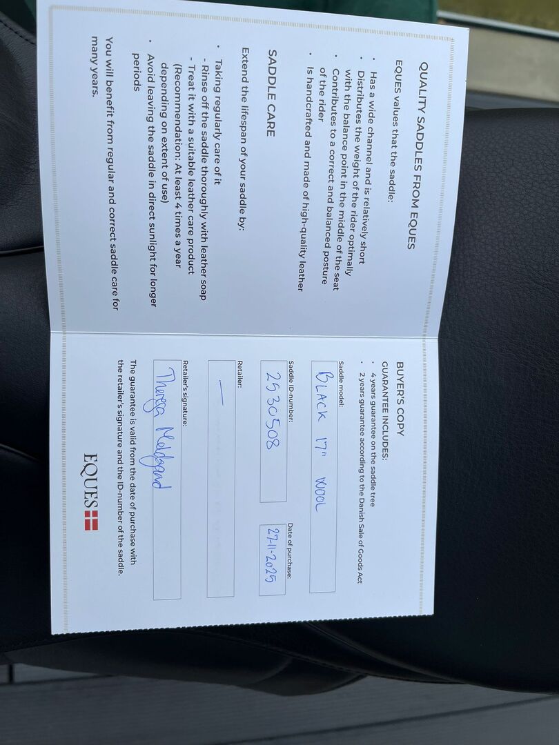 Siodło Eques czarne, 17 cali, wełna, nowe z kartą gwarancyjną producenta - Sprzedam nowe i nieużywane siodło Eques Black z 17-calowym siedziskiem, wełnianymi panelami, ochraniaczem na siodło i kartą gwarancyjną od producenta z datą zakupu 27.11.2025. Nowa cena to 2 665 €.