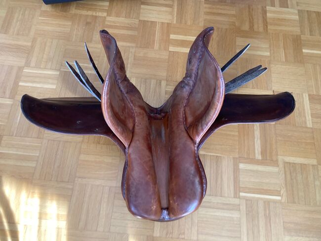 Siodło eventowe / siodło skokowe - Dobrze utrzymane siodło eventingowe z naciskiem na skoki w kolorze brązowym, z 3 paskami po każdej stronie, szerokość komory 16 cm, bez strzemion, bez popręgów i bez popręgu