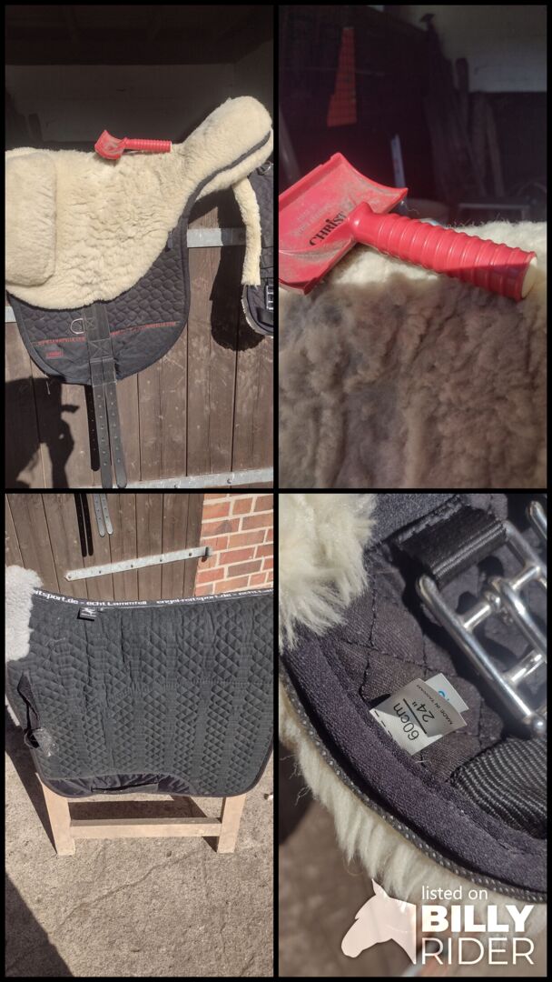 Siodło futrzane Christ WB z podkładką pod siodło, popręgiem, szczotką - Futrzany zestaw siodeł Siodło Christ, rozmiar WB Podkładka pod siodło Engel Dr. Obwód 60 cm Szczotka do skóry jagnięcej od Christ Siodło było zawsze używane z podkładką pod siodłem, więc siodło wygląda jak nowe od spodu..... Podkładka pod siodło z niewielkimi śladami zużycia .... Podkładka pod siodło Engel w kolorze szarym,... Popręg z jagnięcej skóry....