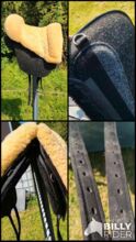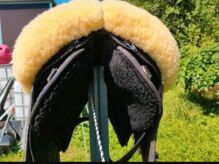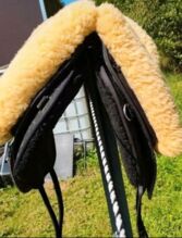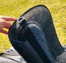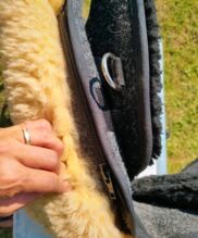 Siodło Grandeur flowfinder hide - Jak widać na zdjęciach, to siodło jest prawie jak nowe Skóra jagnięca nie jest przetarta, a wyściółka nie jest zdeformowana. Podstawa siodła wykonana jest z wytrzymałego igłowanego polaru. Imponuje swobodą kręgosłupa i odciążeniem, nawet przy wadze jeźdźca, i nadal jest bardzo wygodne i bezpieczne.