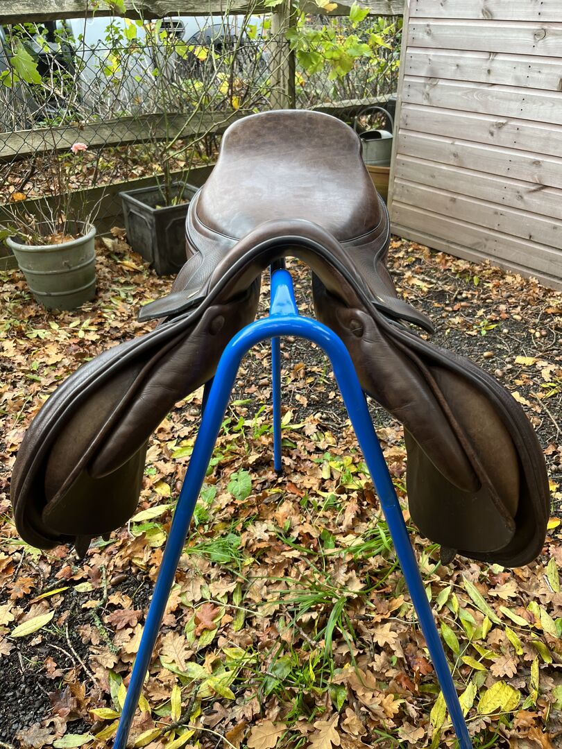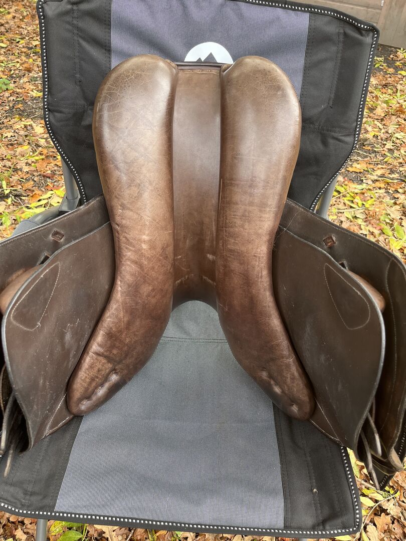 Chocolate all calfskin M/M double flap, very comfortable. Bought second hand, but good condition. Unfortunately unable to use as seat too long for my pony.
