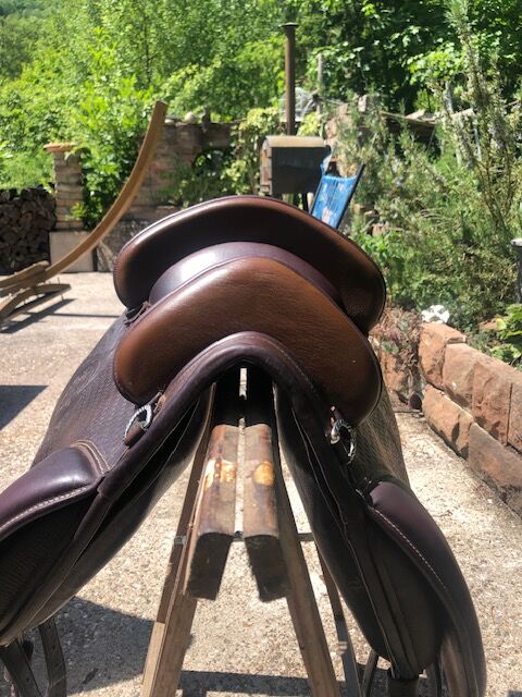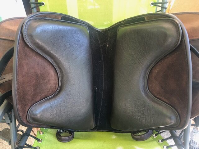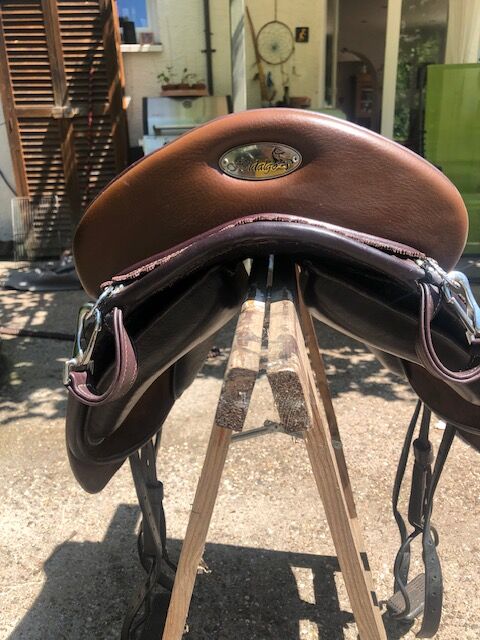 Brązowe skóry mono strzemion i klapą od Hidalgo Siodło zawsze było przechowywane w suchym miejscu. Z pomiarami: Rozmiar siedziska 16` powierzchnia styku nieco poniżej 50 cm Długość klapy siodła. 37cm