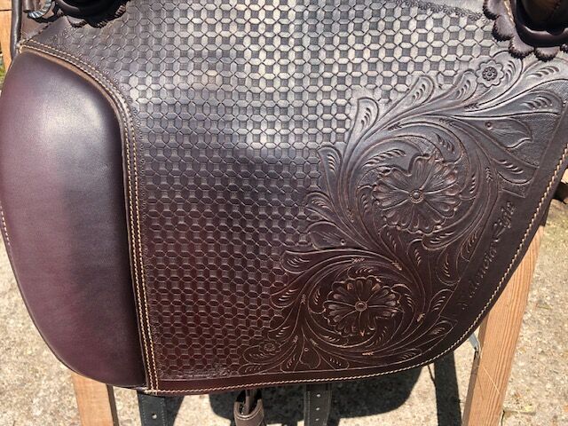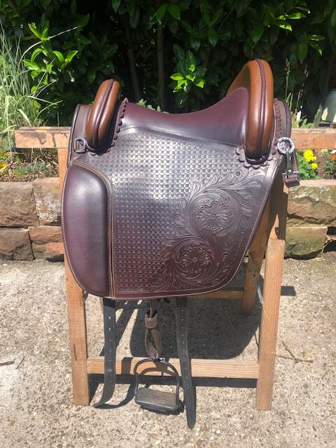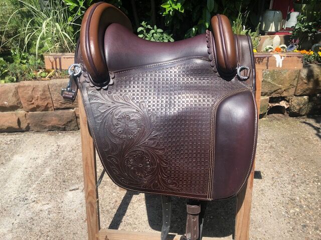 Siodło Hidalgo Leather Tree dla krótkich grzbietów - Szykowne siodło Hidalgo z wyszukanymi znakami, rzadki model. Siodło było kupione 1,5 roku temu i bardzo rzadko używane, ponieważ koń miał/ma poważne problemy. (Siodło jeszcze się nie ułożyło. Sprzedam w komplecie z :