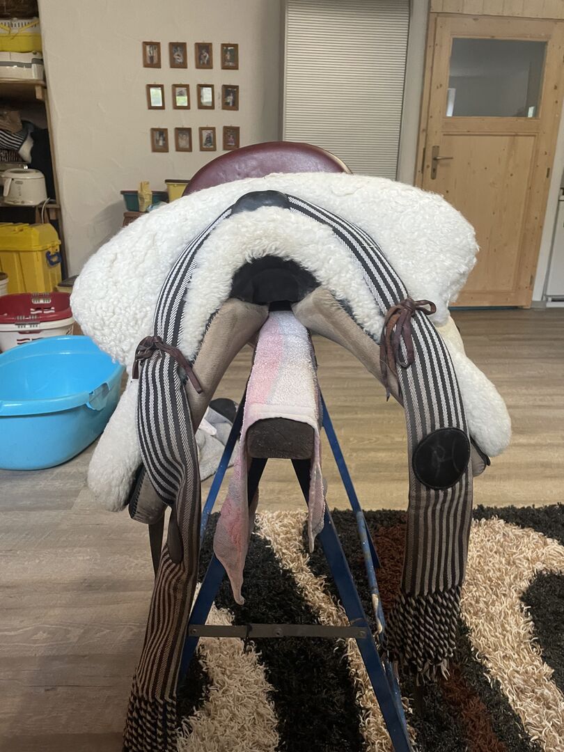 Siodło hiszpańskie / siodło skórzane / elastyczne drzewo / siodło barokowe / szerokie konie - Chętnie używana Vaquera, model Pablo Hermoso od Gomez Hiszpania z siedziskiem 35 cm. W komplecie plastikowe strzemiona pudełkowe, skóry strzemion, zielona klapa do jazdy, nowa klapa w paski i Manta Estribera w paski (tkanina campo). To siodło ma elastyczny łęk. Motyl od komory 32 (z czarną płytą wpustową Wintec) do 35 i więcej.