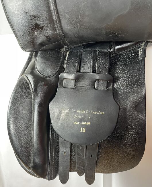 Siodło John Webb VS Haflinger, czarne, 18" + skórzane strzemiona - Sprzedaję moje siodło John Webb dla Haflingera i innych wytrzymałych ras. Czarne siodło z 18-calowym siedziskiem było używane tylko na sportowym norwegu i było przechowywane w suchej piwnicy przez ostatnie kilka lat. Siodło jest zadbane i w bardzo dobrym stanie. Klapa siodła jest pokryta zamszem na rolkach kolanowych, a wiele części jest wykonanych z bardzo gruboziarnistej skóry. Paski do popręgu są całkowicie nienaruszone, nie mogę określić dokładnej szerokości łęku ani odpowiedzieć, czy można to zmienić. Pomiary na życzenie. Siodło jest dostarczane z klapą siodła i strzemionami, które są niestety zużyte. Bez dalszych akcesoriów, takich jak strzemiona lub popręg, ale mam tego rodzaju przedmioty w sprzedaży prywatnej.