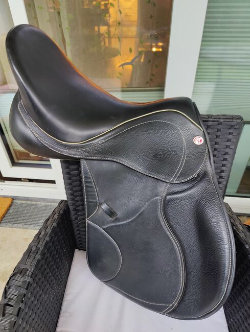 Siodło Kieffer Le Mans do wyścigów konnych - Na sprzedaż roczne siodło Kieffer Le Mans w kolorze czarnym z białymi kontrastowymi przeszyciami. Zostało zamontowane na szerokim huzulu bez kłębu i jest również przeznaczone dla szerokich koni o raczej prostych grzbietach. Rozmiar siedziska to 17,5 cala. Nowa cena wynosiła 2700 €, certyfikat siodła jest dostępny. W razie potrzeby mogę również dodać popręg z pianki pamięciowej 125 cm.