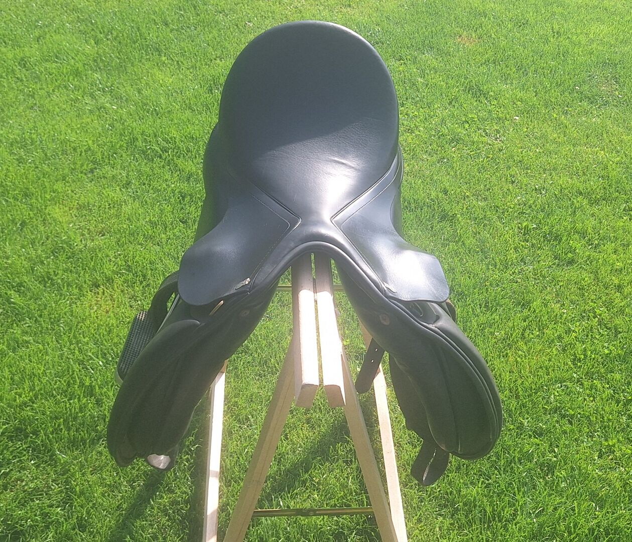 Siodło Massimo VSD, 17 cali, KW(36) 38, panele francuskie - Ponieważ mój koń niestety nie nadaje się już do jazdy, sprzedaję siodło Massimo VSD, krótkie panele francuskie, łęk ok. 38 cm, rozmiar 17 cali. Szerokość komory 36 jest wytłoczona. Wełniane panele mogą być wyściełane w razie potrzeby. Normalne ślady użytkowania. Brak rozdarć i dziur. Ale może być ponownie pokryte skórą. Siodło zawsze może być łatwo wyregulowane przez rymarza. Siodło zostało zamontowane na norweskim 148 cm. Strzemiona i paski były używane tylko kilka razy (jak nowe)