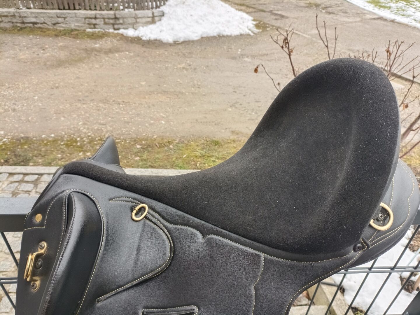 Siodło Norton - Baroque Saddle/Dressage Saddle - czarne z fantazyjnymi zdobieniami - Siodło letnie: styl barokowy z przednią i tylną galerią Kolor: czarny ze złotymi zdobieniami Powierzchnia siedziska: tkanina - nadaje bardzo szlachetny wygląd Powierzchnia kontaktowa konia: tkanina (taka sama jak powierzchnia siedziska) Wady: W najlepszym stanie, ale małe rozdarcie (patrz zdjęcia) Możliwy odbiór osobisty: Ried im Innkreis możliwa wysyłka