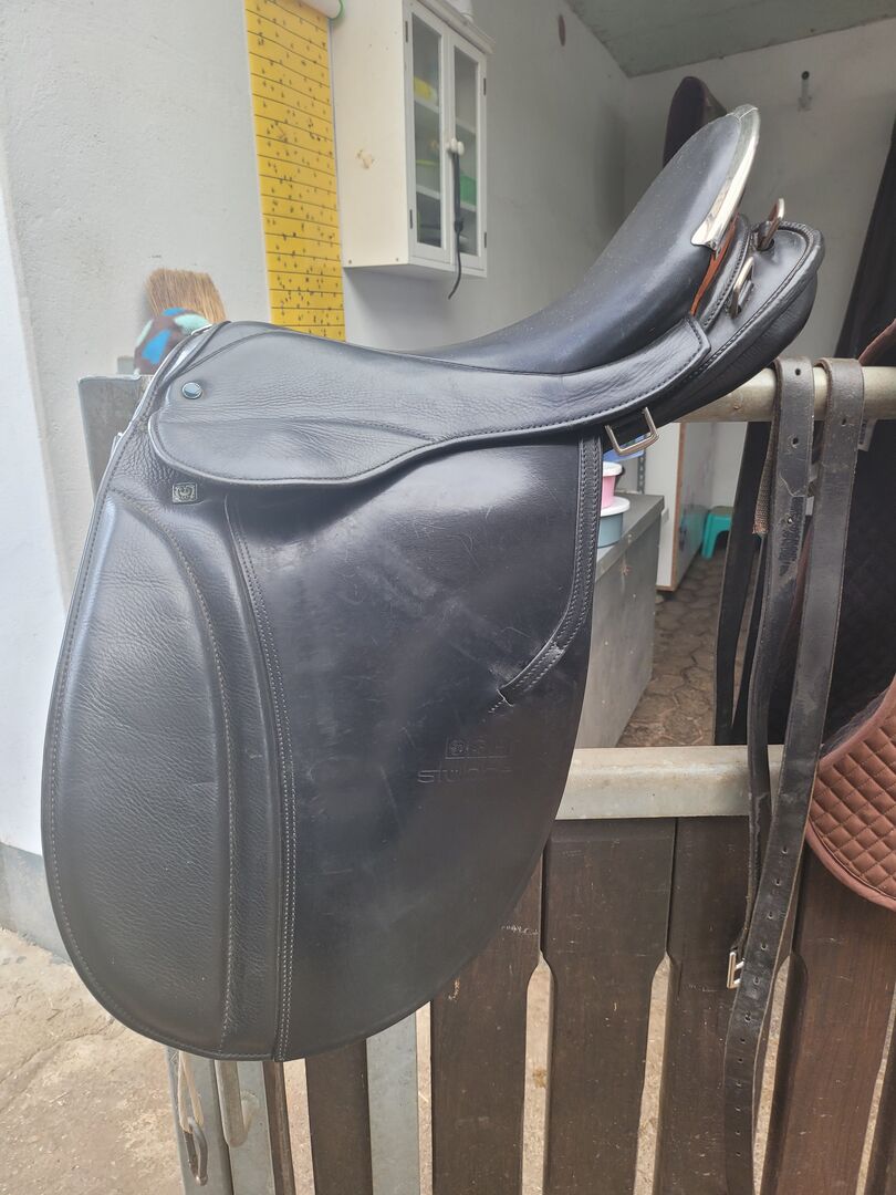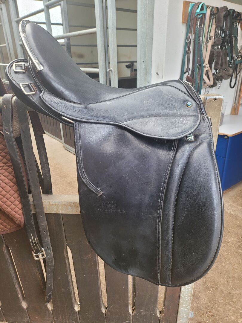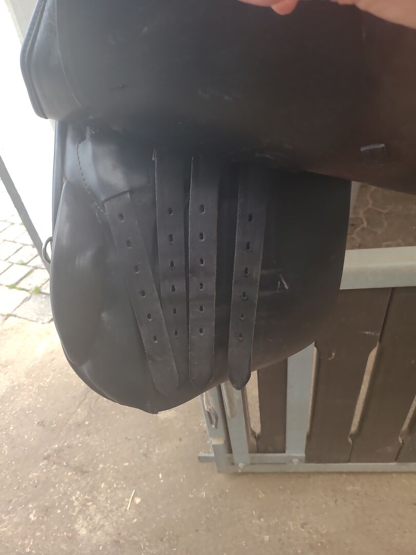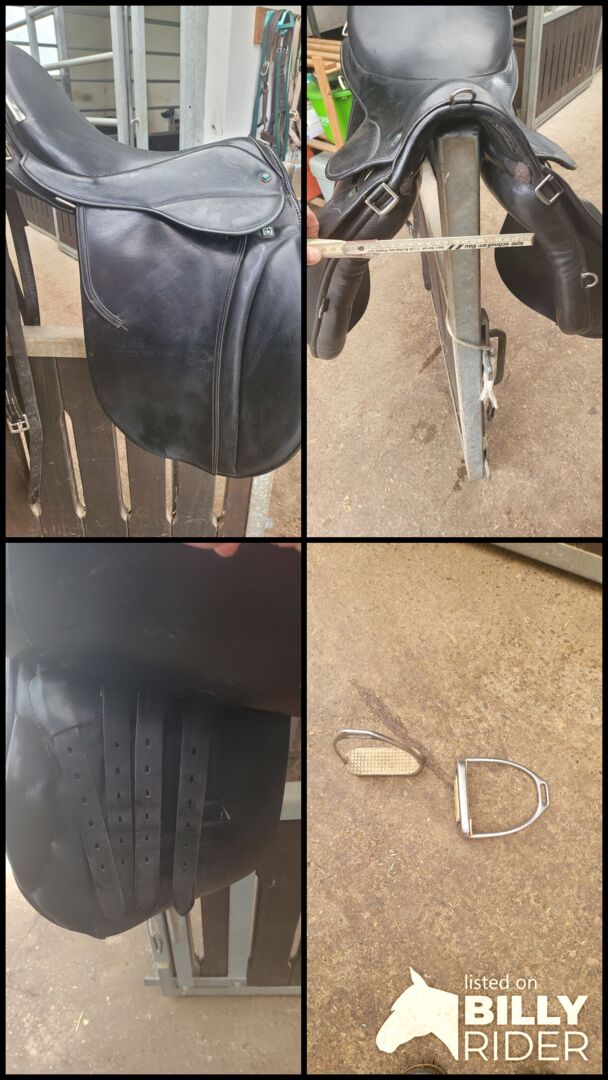Siodło podróżne Stübben Scout - Siodło ma 18-calowe siedzisko. Bardzo ładne w kolorze czarnym z kontrastującą skórą w kolorze koniaku z tyłu. Siodełko ma system 4 rozpórek dla lepszego dopasowania siodełka i wiele pierścieni do mocowania sakw. Kupiłem je z drugiej ręki, niestety jest trochę za długie. W dobrym stanie, ponieważ nie było dużo używane, płytę wpustową można zmienić. Brak gwarancji lub zwrotów, jako sprzedaż prywatna