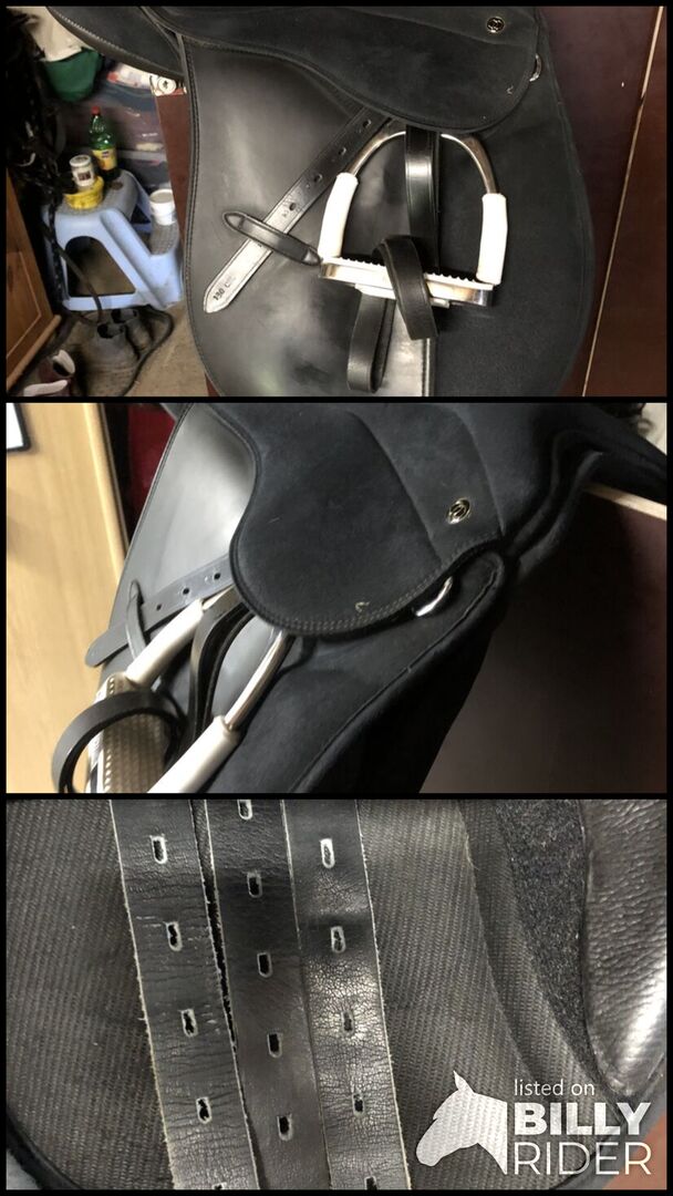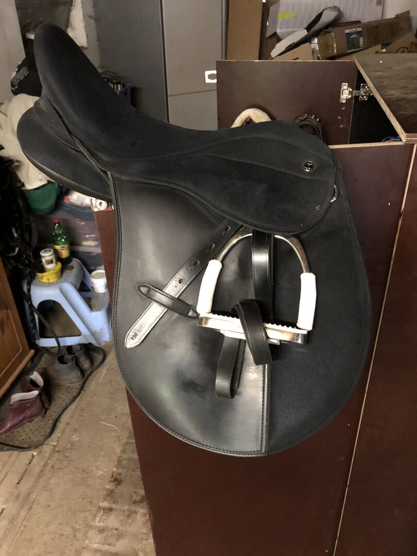 Siodło rajdowe 16,5 cala - Używane siodło skokowe w rozmiarze 16,5 cala. W razie potrzeby również z ochraniaczami na pasy, strzemiona i strzemiona. Siodło nie było często używane i było dobrze utrzymane. Płyta wpustowa ma szerokość 30 cm i 5 cm z tyłu kanału zawirowującego.