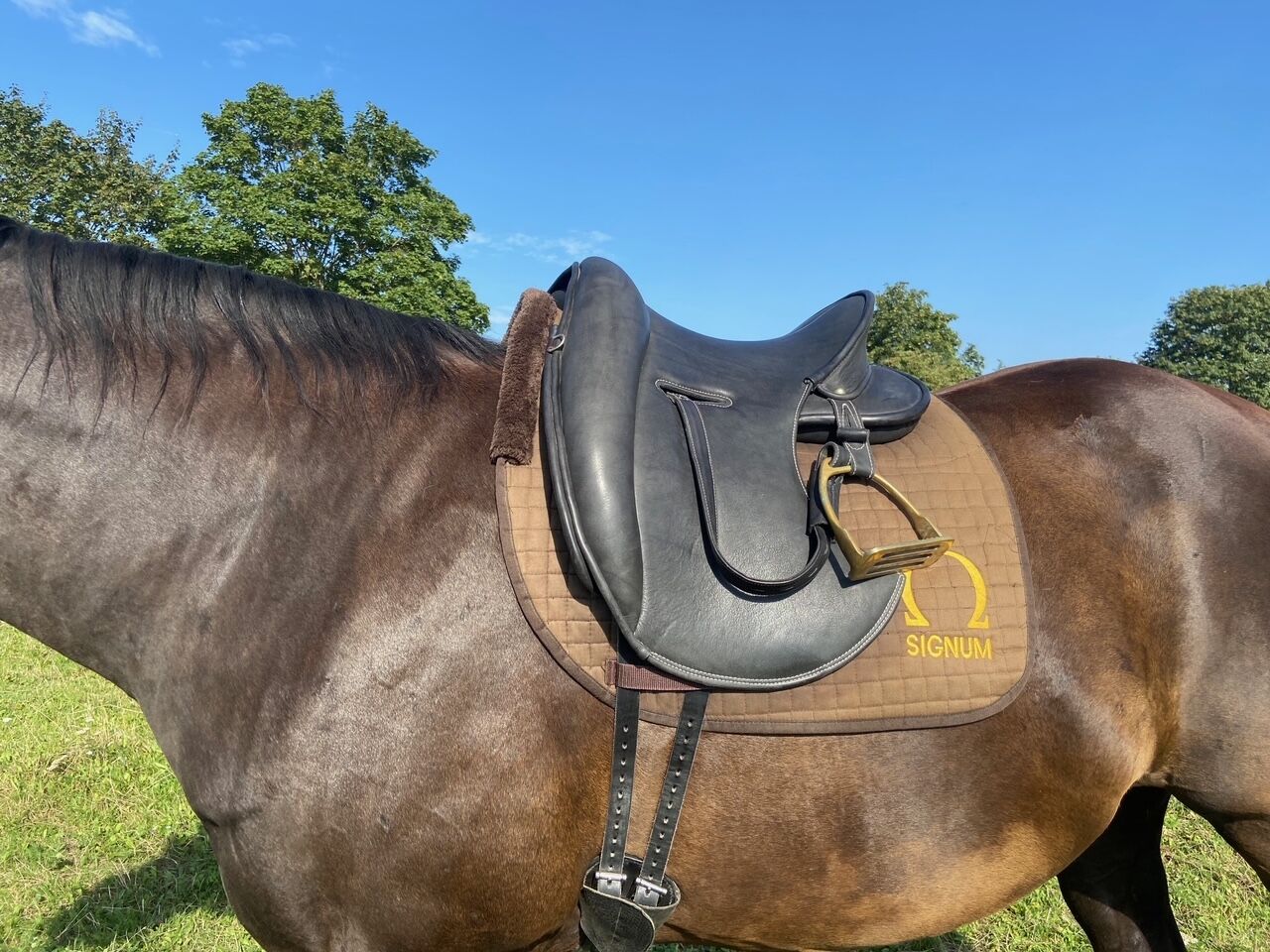 Siodło Signum Mercedes - Sprzedam używane siodełko Signum Mercedes w kolorze czarnym. Nie było często używane. Rozmiar siedziska to 17,5 cala. Długość łęku to 0,5, kieszeń 2, pad 4 3,53, gullet plate CK 38 cm, żebrowane pręty strzemion 35 cm, typ łęku 3. Siodło sprzedawane jest ze strzemionami w kolorze mosiężnym i podkładką Signum z syntetycznego futra w kolorze brązowym. Siodło może być spersonalizowane przez Signum Saddle Service. Sprzedaż prywatna bez gwarancji i zwrotu.