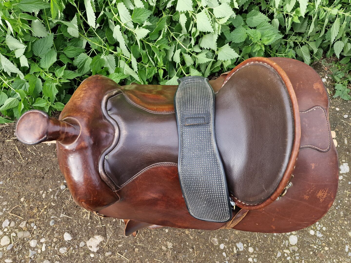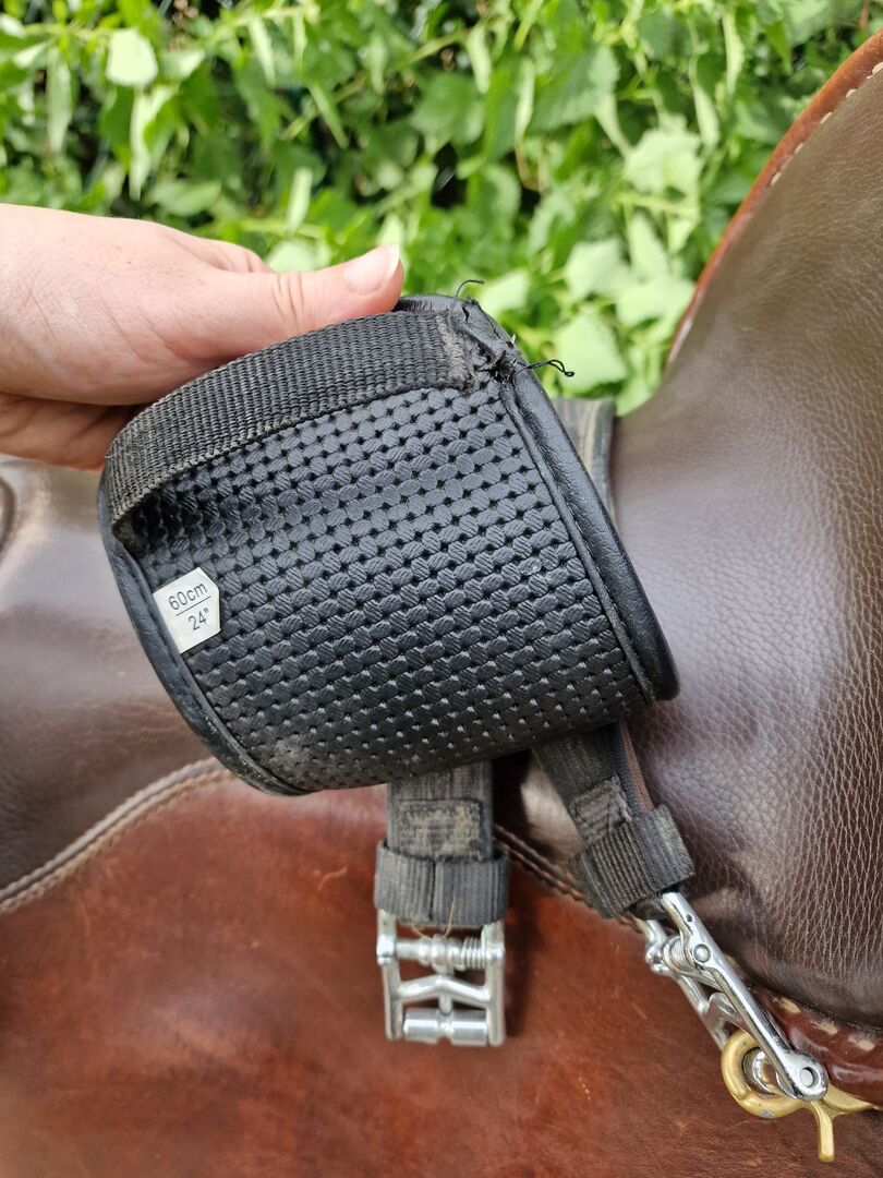 Z popręgiem siodła czarnym 60cm. Jedna pętla na popręgu wymaga ponownego przyszycia.