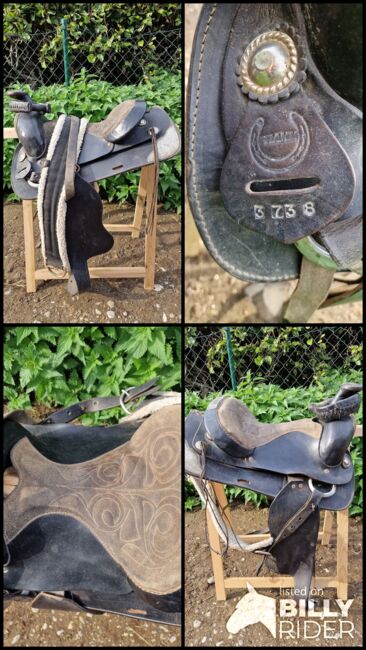 Westernowe siodło czarne od Frahm bardzo lekkie siodło z oryginalnymi srebrnymi okuciami, z popręgiem, brakuje jednego strzemienia.