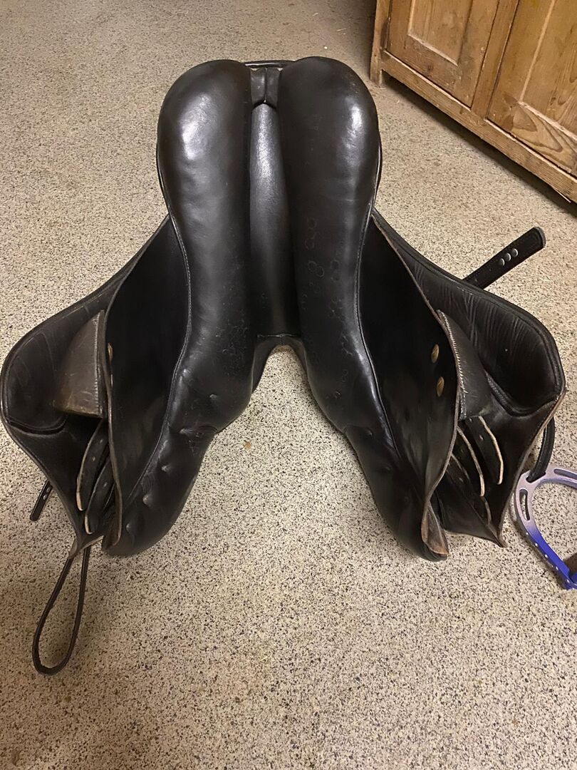 Siodło skokowe - W związku ze sprzedażą konia używane siodło z zamszowymi pomponami i siedziskiem o średniej szerokości łęku i siedzisku 18''.