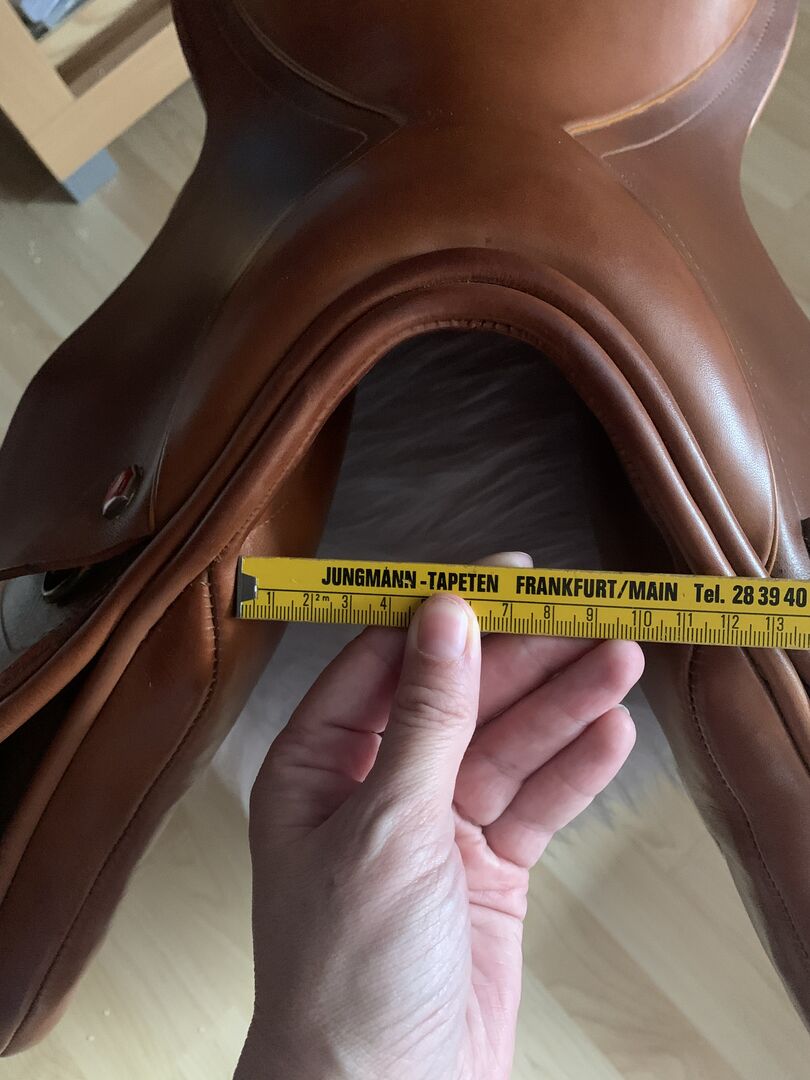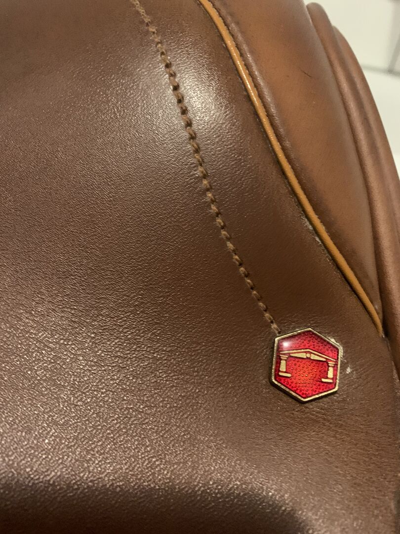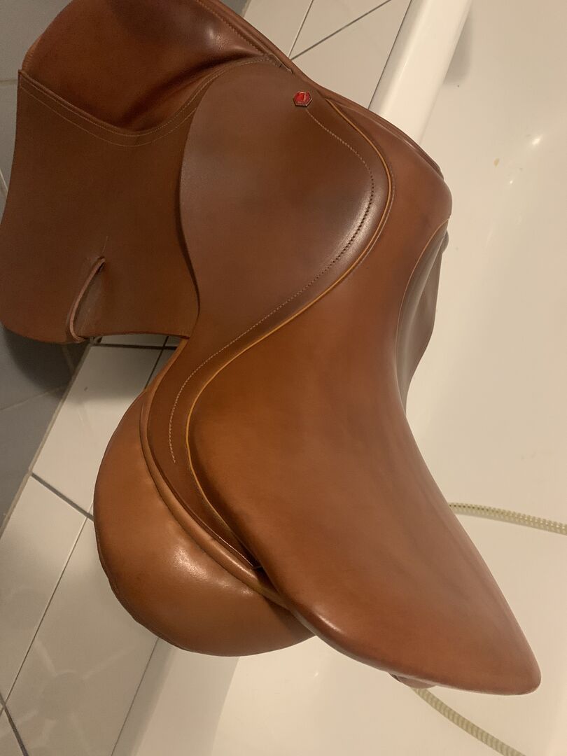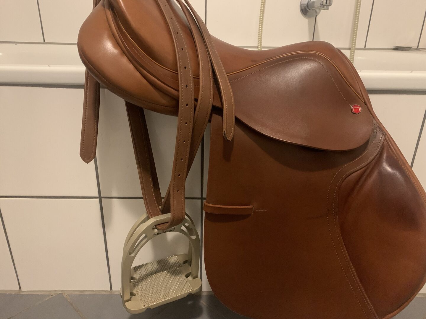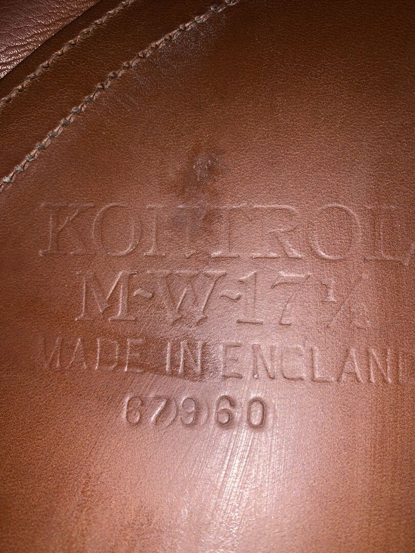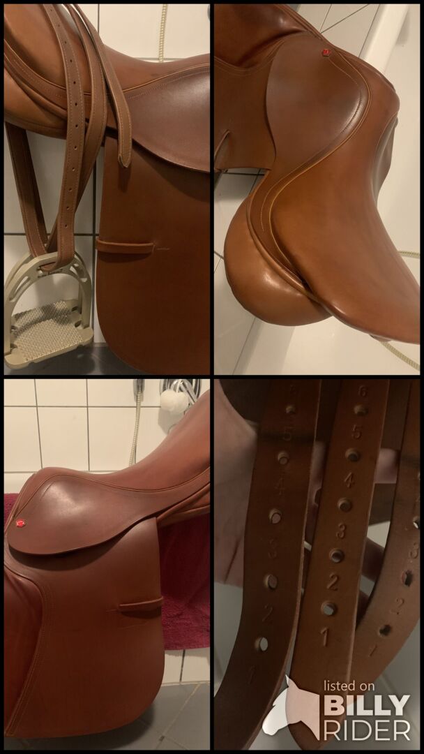Model: Kontrol Konstrukcja: FF Płaski przód Rozmiar siedziska: 17,5 cala Komora: MW (ok. 32) Wyściełanie: wełna Kolor: karmelowy, bardzo rzadko spotykany w tym kolorze Rolki kolanowe regulowane za pomocą rzepów Krótkie pasy do długiego obwodu Szeroki kanał siodłowy Obcięta komora tylna, dzięki czemu jest wystarczająco dużo miejsca na wysoki podbicie. Powierzchnia podparcia ok. 45 cm