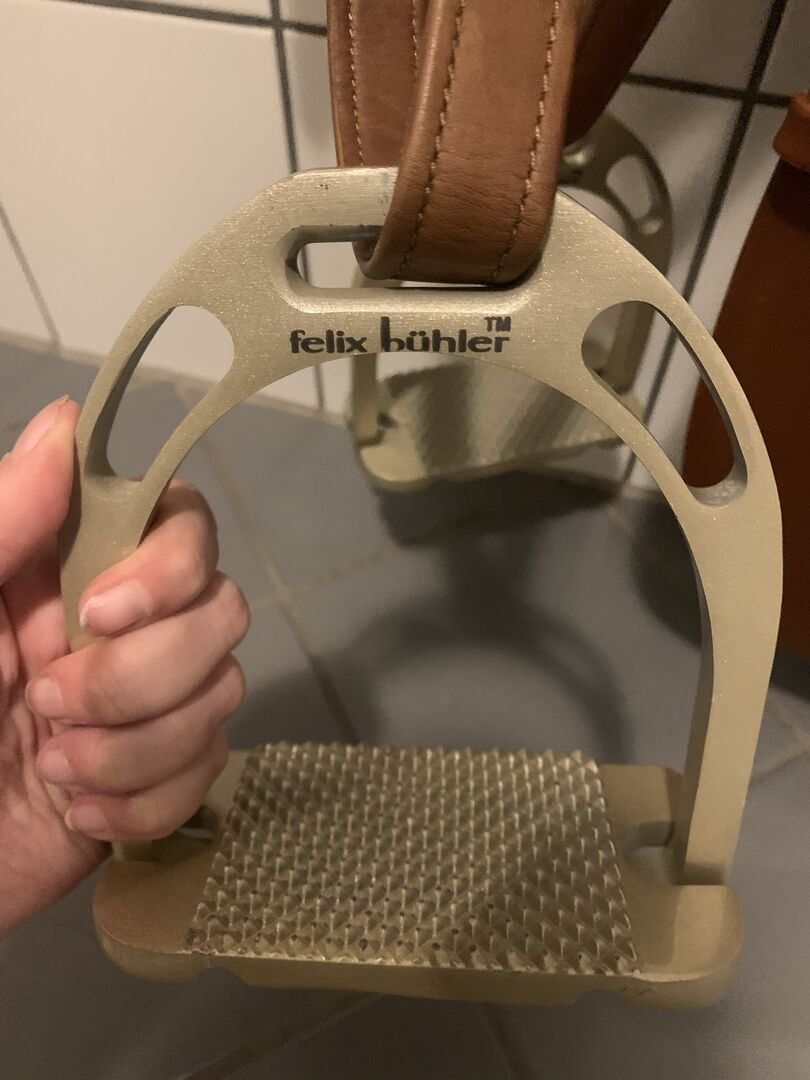 W komplecie aluminiowe strzemiona Felix Bühler z metalicznym wykończeniem i bieżnikiem o szerokości 7 cm w kolorze szampańskim.