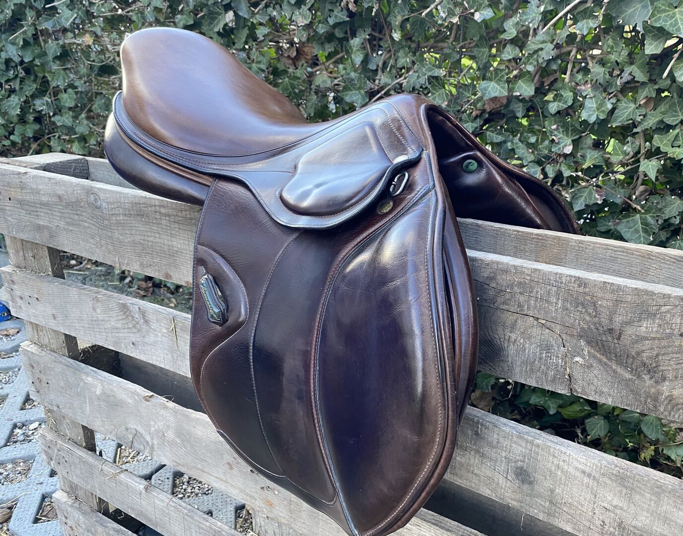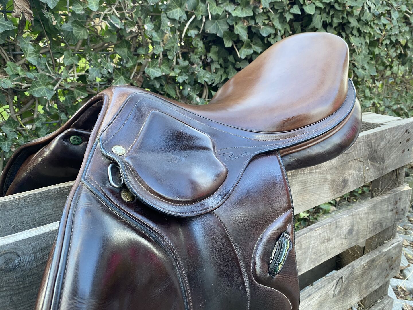 Siodło skokowe Amerigo w pięknym brązowym kolorze 17,5 - Na sprzedaż siodło skokowe Amerigo w pięknym brązowym kolorze Kupione nowe w 2013 roku Ze skórą Pinerolo dla lepszej przyczepności. Dopasowane do konia z dużym podbiciem. Komora może być regulowana przez rymarza Siodło ma normalne ślady użytkowania Nowa cena wynosiła 3900 Cena VHB