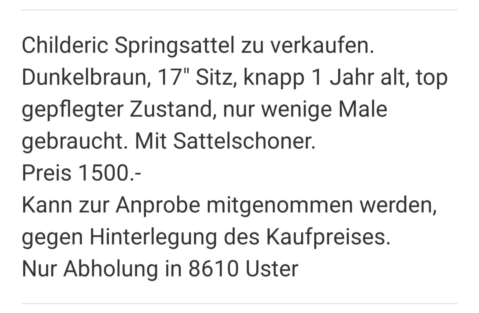 Hi Mirjam Bissegger, I am interested in your ad 'Childeric Springsattel / Childeric'. Please contact me! 😊